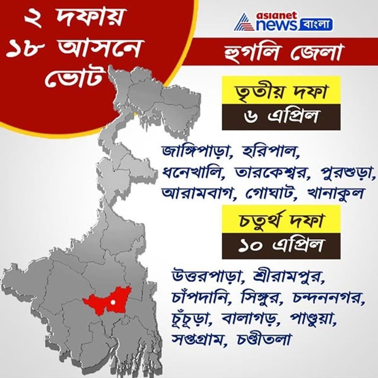 একনজরে দেখে নেওয়া যাক হুগলি জেলার কবে কোথায় তৃতীয় ও চতুর্থ দফায় ভোটগ্রহণ। জাঙ্গিপাড়া, হরিপাল, ধনেখালি, তারকেশ্বর, পুরশুড়া, আরামবাগ, গোঘাট, খানাকুল-- এই ৮টি আসনে ভোট হবে তৃতীয় দফায় মানে ৬ এপ্রিল।