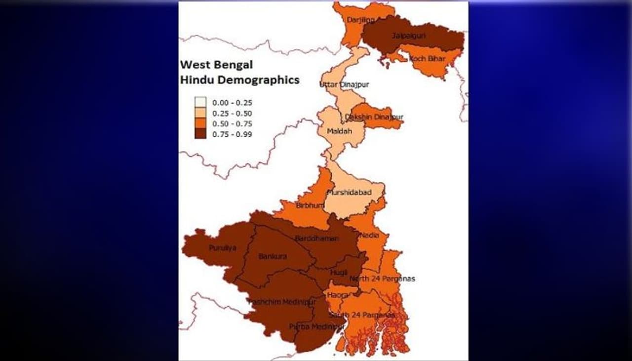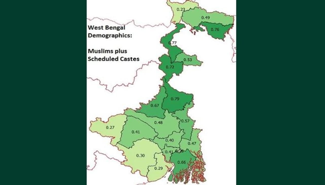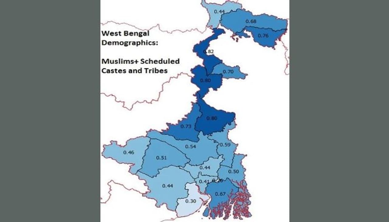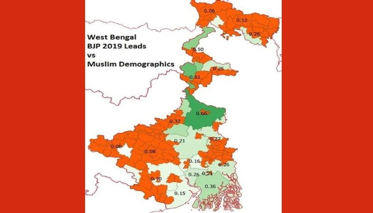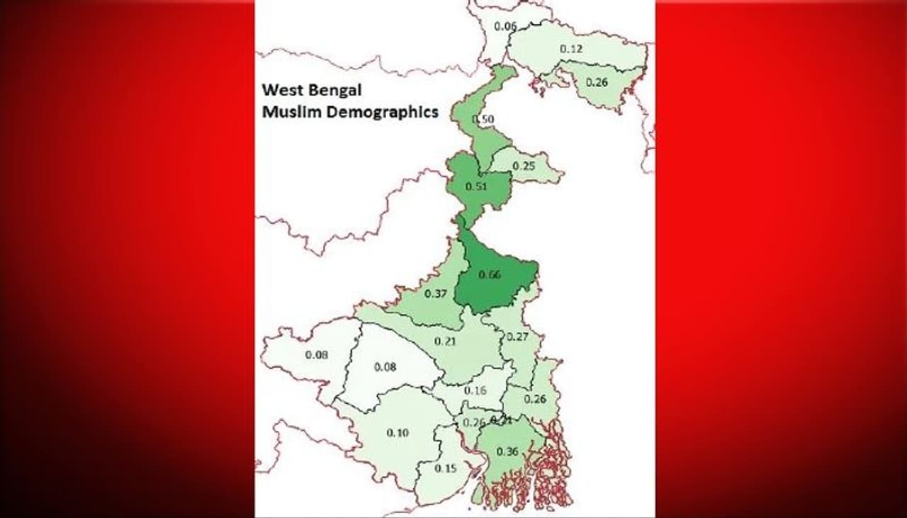 ২। দেখা যাচ্ছে রাজ্যের সীমান্তবর্তী অঞ্চল এবং তার সন্নিহিত অঞ্চলে মুসলিম জনঘত্বের ছবিটা।