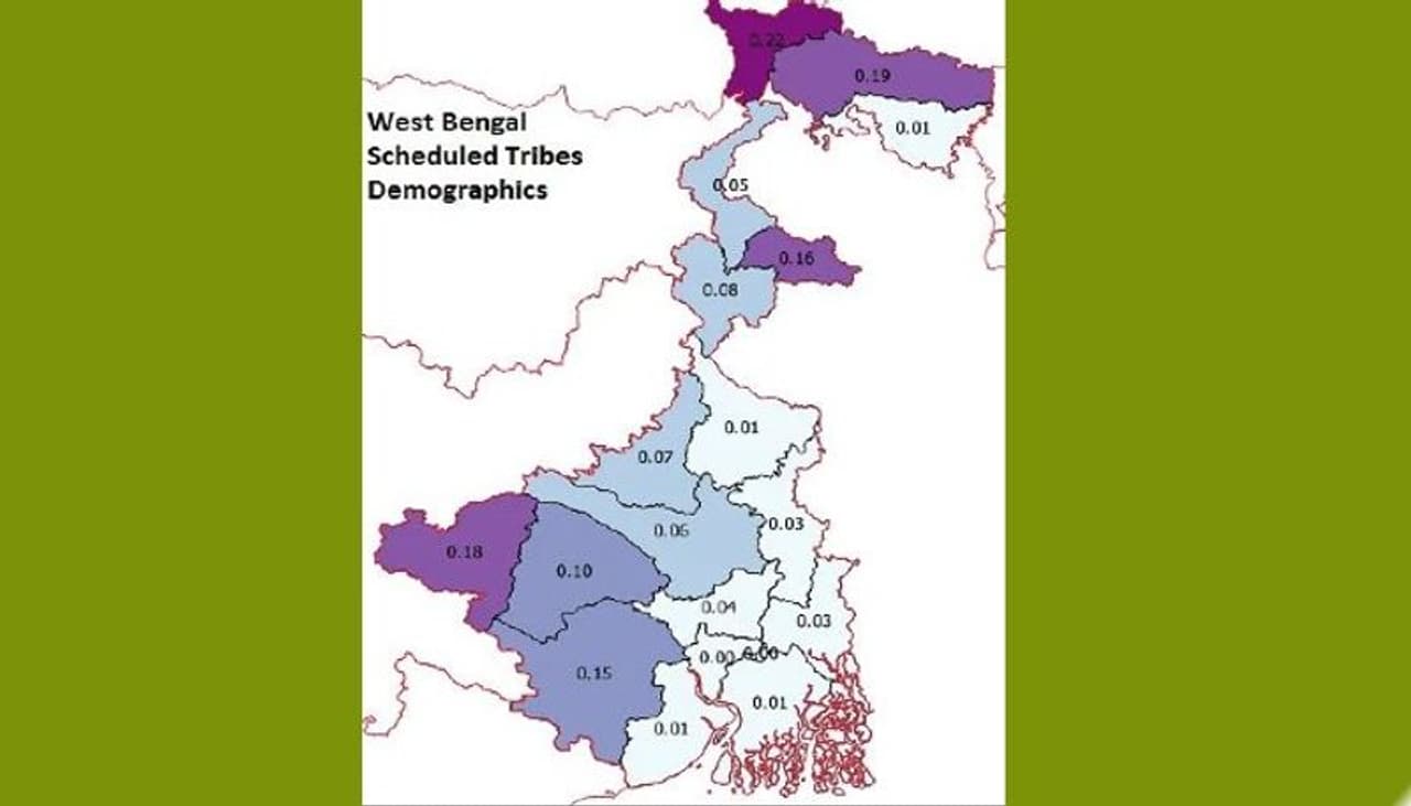 ৩। এখানে সামনে উঠে এসেছে তফসিলি উপজাতিদের জনঘনত্ব দেখানো হচ্ছে। লক্ষ্য করলে দেখা যাবে কিছু জেলা, যেমন দার্জিলিং (২২ শতাংশ), জলপাইগুড়ি (১৯ শতাংশ), পুরুলিয়া (১৮ শতাংশ) দক্ষিণ দিনাজপুর (১৬ শতাংশ) এবং পশ্চিম মেদিনীপুরে (১৫ শতাংশ) তফসিলি উপজাতির লোকজন তুলনায় বেশি।