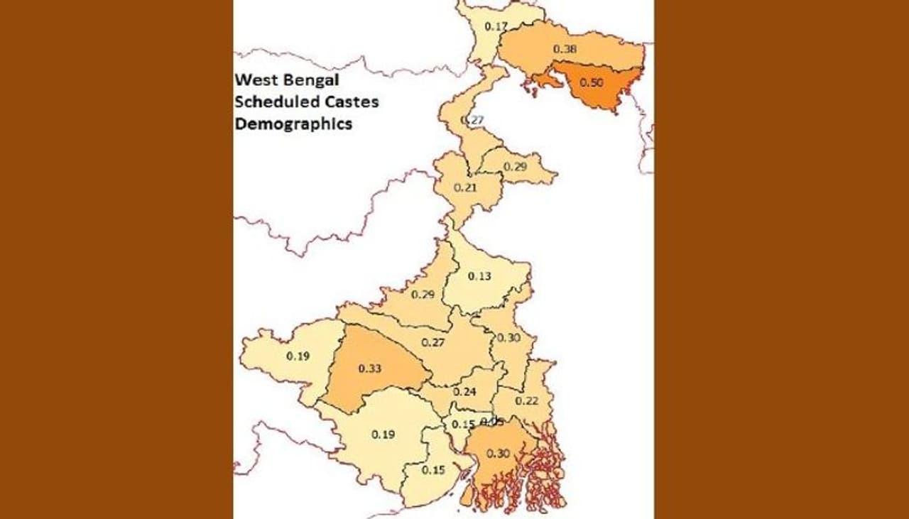৪। তফসিলি জাতির জনঘনত্ব কেমন রাজ্যে তা এই মানচিত্রে পরিস্কারভাবে ফুটে উঠেছে। এটি গুরুত্বপূর্ণ কারণ ২০১৬ সালের বিধানসভা ভোটে তফসিলি জাতি ও মুসলিমদের ভোটের একটা বড় অংশ তৃণমূলের পক্ষে গিয়েছিল।
