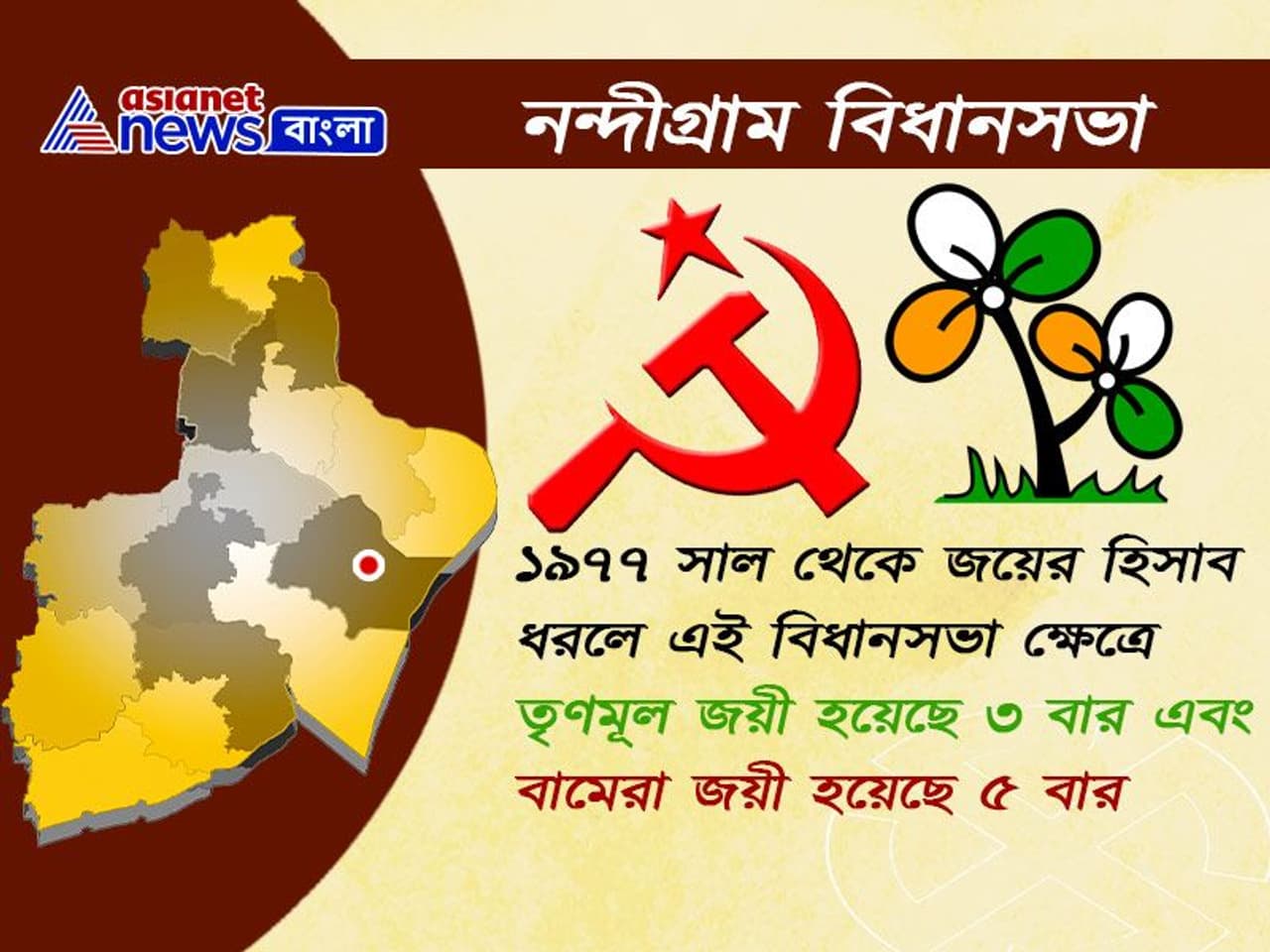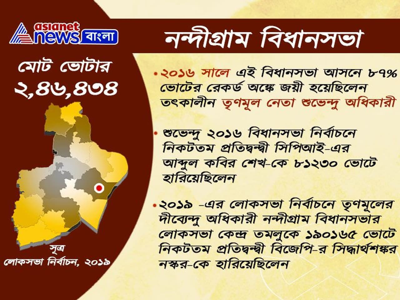 ২০১৬ সালের বিধানসভা নির্বাচনে নন্দীগ্রাম বিধানসভায় জয়ী হয়েছিলেন শুভেন্দু অধিকারী। তৃণমূল কংগ্রেসের ঘাসফুল চিহ্নে দাঁড়ানো শুভেন্দু- রেকর্ড ভোটে জয় পেয়েছিলেন। তাঁর নিকটতম প্রার্থী সিপিআই-এর আব্দুল কবির শেখের থেকে তাঁর প্রাপ্ত ভোটের ব্যবধান ছিল ৮১২৩০। ২০১৯ লোকসভা নির্বাচনে নন্দীগ্রামের লোকসভা আসন তমলুক থেকেও জয়ী হয়েছিল তৃণমূল কংগ্রেসের প্রার্থী। সেই ভোটে শুভেন্দু-র ভাই দিব্যেন্দু অধিকারী নন্দীগ্রামের লোকসভা ক্ষেত্র তমলুক থেকে ১৯০১৬৫ ভোটে জয়ী হয়েছিলেন। তাঁর নিকটতম প্রতিদ্বন্দ্বী হিসাবে উঠে এসেছিলেন বিজেপি প্রার্থী সিদ্ধার্থশঙ্কর নস্কর।