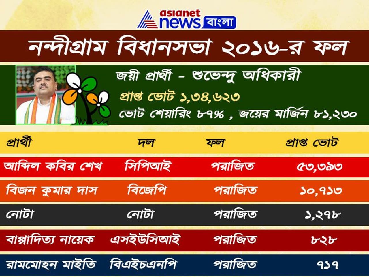 ২০১৬-র বিধানসভা নির্বাচনের নিরিখে নন্দীগ্রামের ফলাফল এরকম- তৃণমূল কংগ্রেসের প্রার্থী শুভেন্দু অধিকারী পেয়েছিলেন ১,৩৪,৬২৩টি ভোটে। ৮৭% মানুষের সমর্থন পেয়েছিলেন তিনি। জয়ের ব্যবধান ছিল ৮১,২৩০ ভোটে। শুভেন্দুর নিকটতম প্রতিদ্বন্দ্বী সিপিআই-এর আব্দুল কবির শেখ পেয়েছিলেন ৫৩,৩৯৩টি ভোট। বিজেপি প্রার্থী বিজন কুমার দাস পেয়েছিলেন ১০,৭১৩টি ভোট।