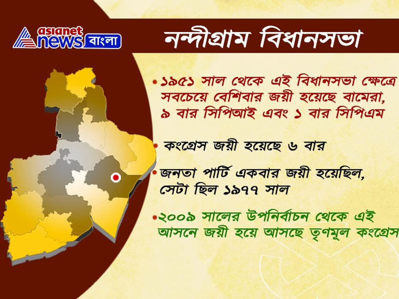 নন্দীগ্রাম বিধানসভা আসনে সবচেয়ে বেশিবার জয়ী হয়েছে বামেরা, ৯ বার সিপিআই এবং ১ বার সিপিএম। কংগ্রেস জয়ী হয়েছে ৬ বার। জনতা পার্টি একবার জয়ী হয়েছিল, সেটা ছিল ১৯৭৭ সাল। ২০০৯ সালের উপনির্বাচন থেকে এই আসনে জয়ী হয়ে আসছে তৃণমূল কংগ্রেস। ১৯৭৭ সাল থেকে জয়ের হিসাব ধরলে এই বিধানসভা ক্ষেত্রে তৃণমূল জয়ী হয়েছে ৩বার এবং বামেরা জয়ী হয়েছে ৫ বার।