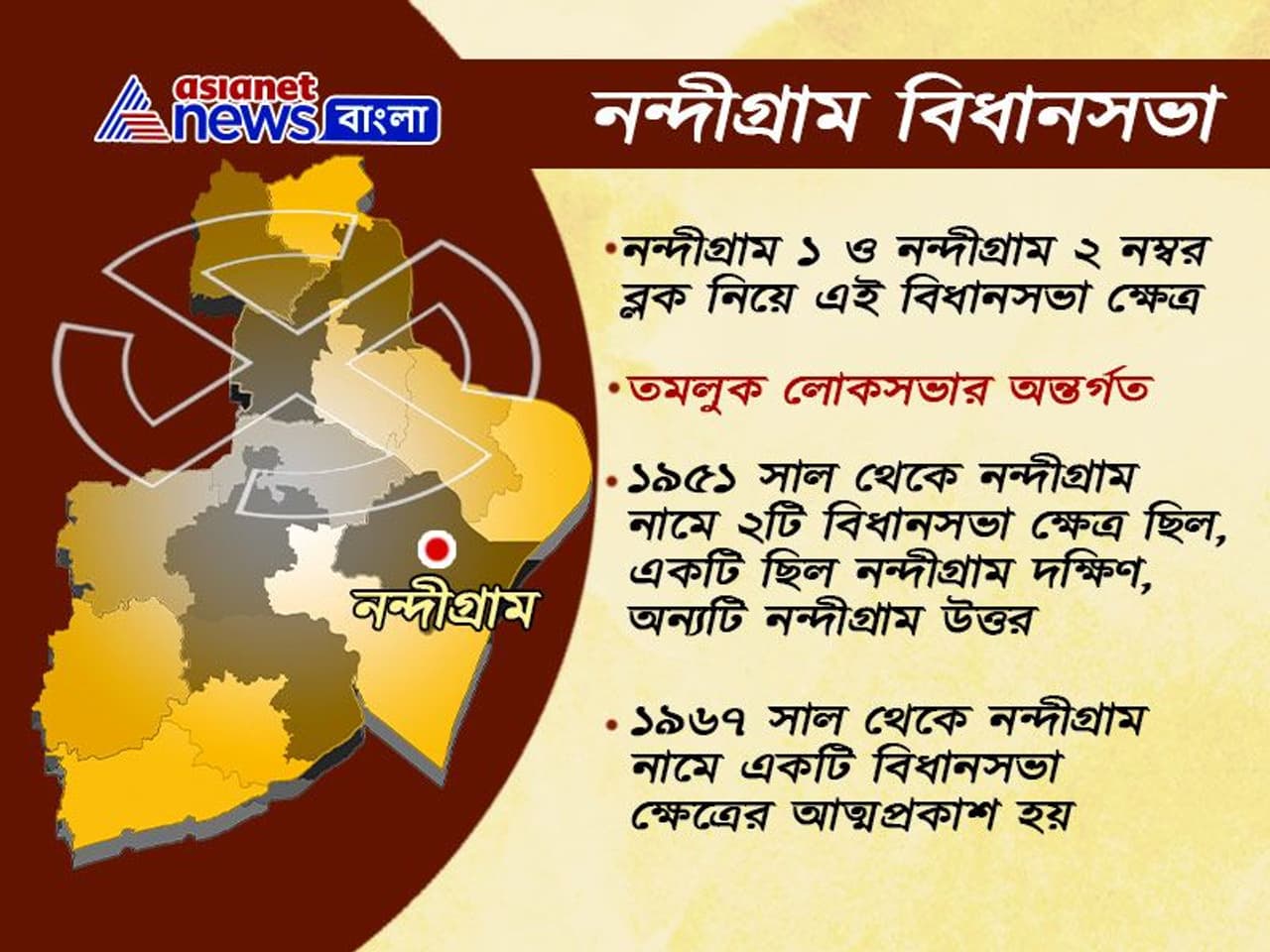 নন্দীগ্রাম বিধানসভা ক্ষেত্রের জন্ম ১৯৫১ সালে প্রথম অবস্থায় এখানে দুটি বিধানসভা ক্ষেত্র ছিল নন্দীগ্রাম প্রচারের আলোয় আসে ২০০৭সাল থেকে  এবারের বিধানসভা নির্বাচনে এই আসনে প্রার্থী হচ্ছেন মমতা