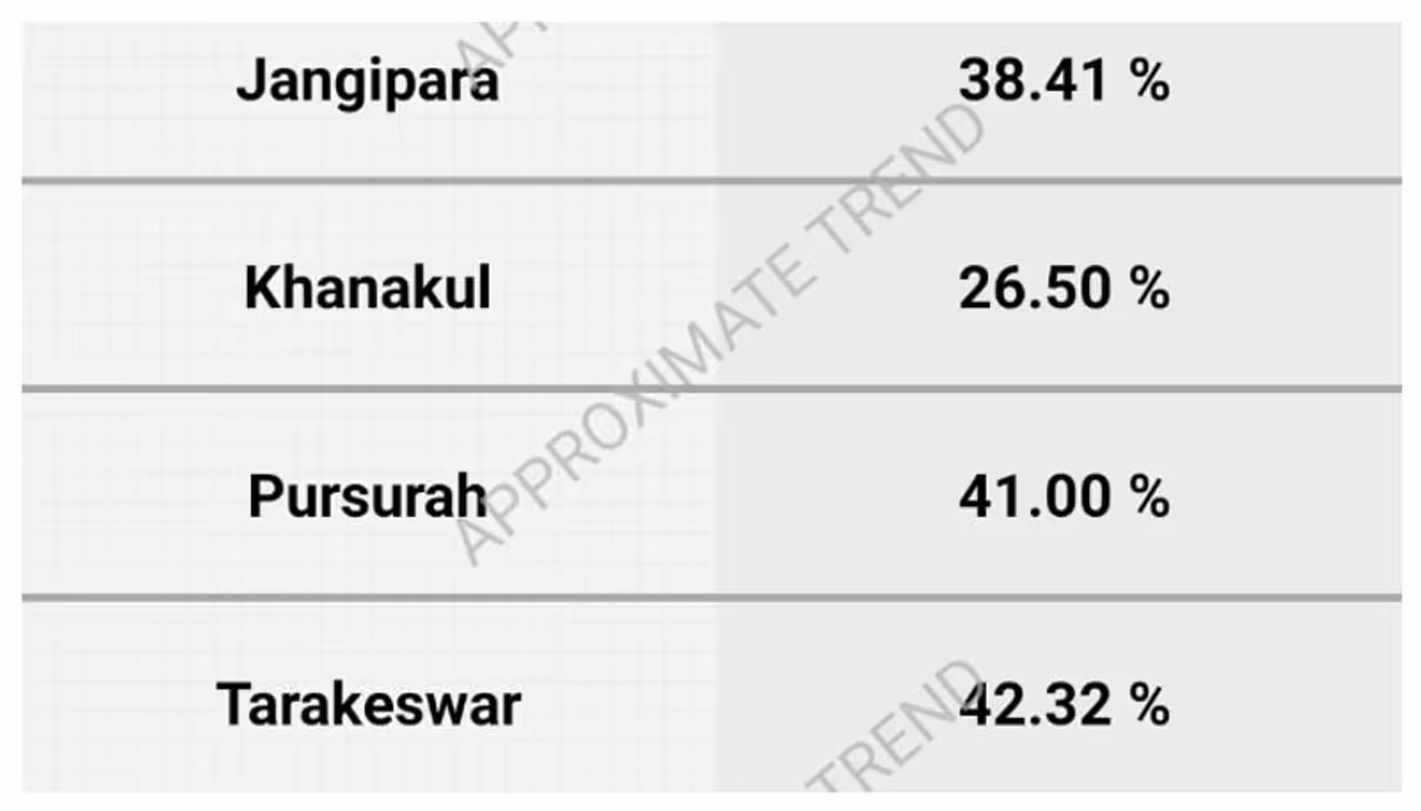 রাজ্যের ৪ গুরুত্বপূর্ণ কেন্দ্র খানাকু, পুরশুড়া, তারকেশ্বর, জাঙ্গিপাড়া। এই চার কেন্দ্রে এখনও পর্যন্ত প্রাপ্ক ভোটদানের হার,