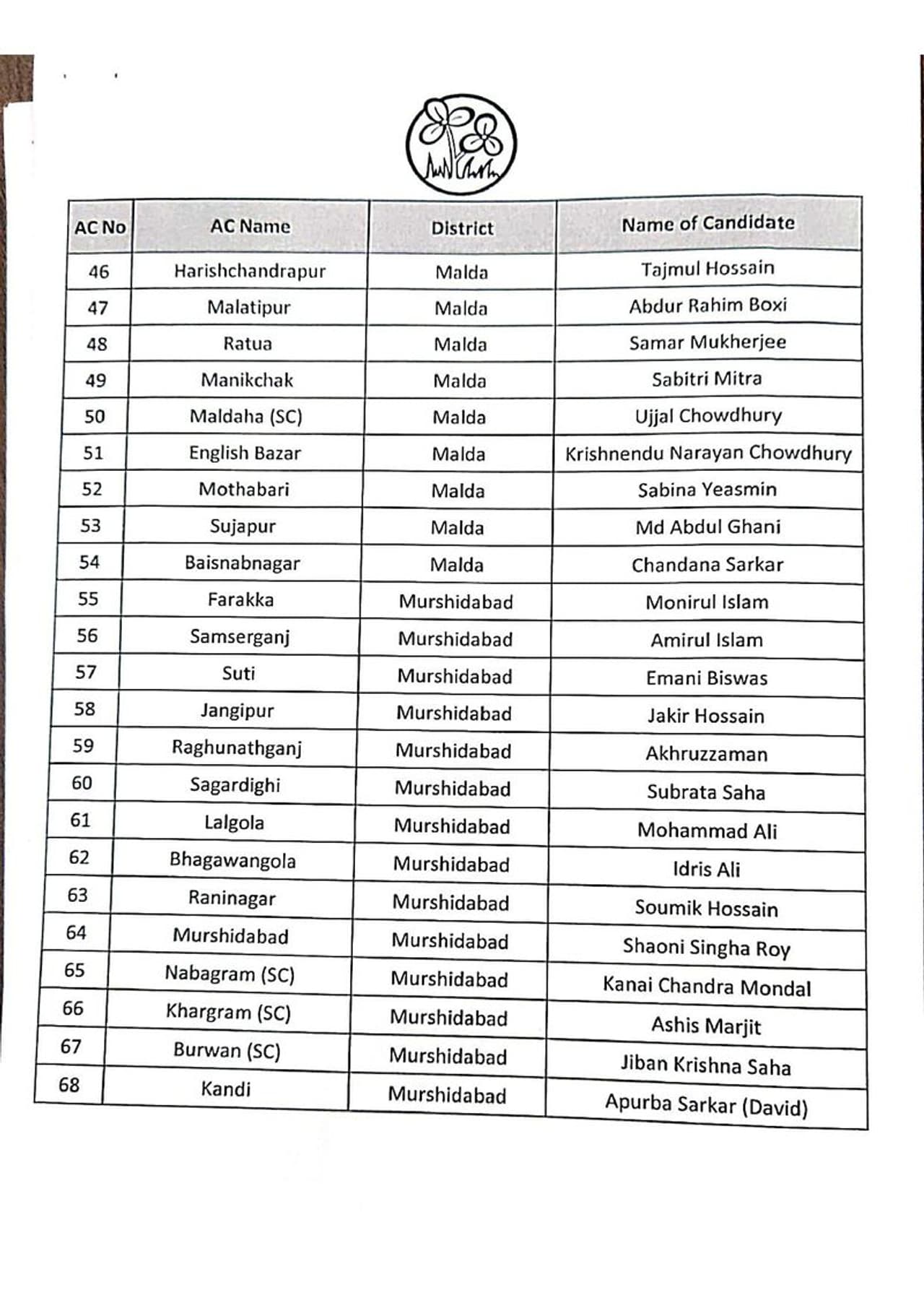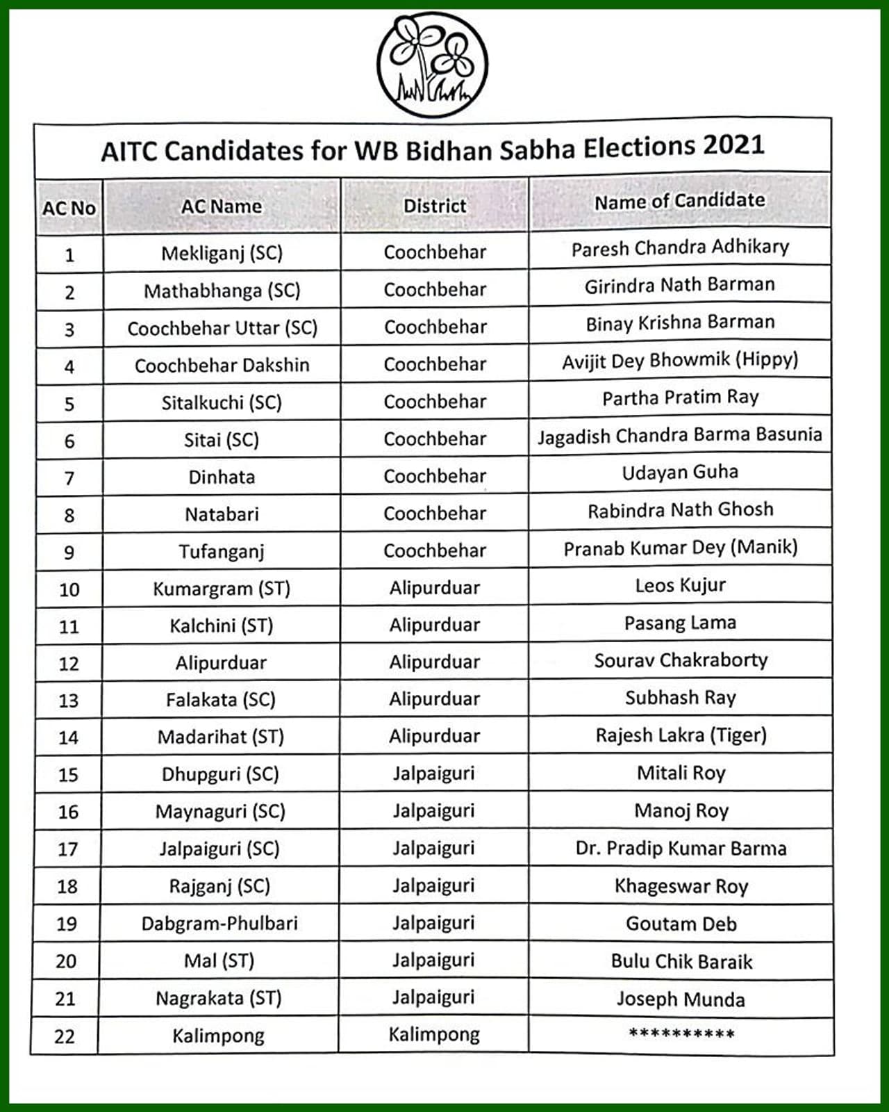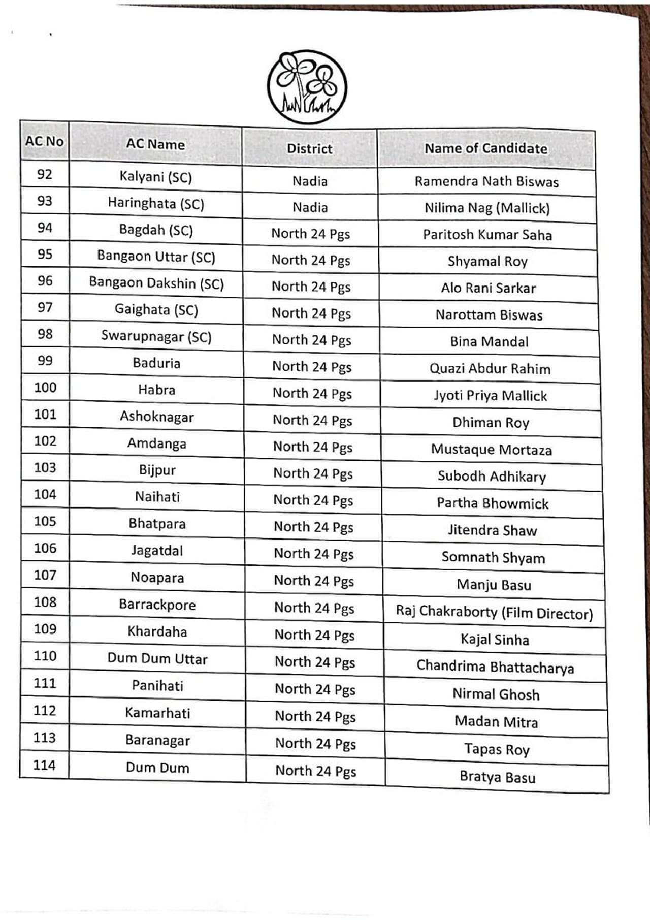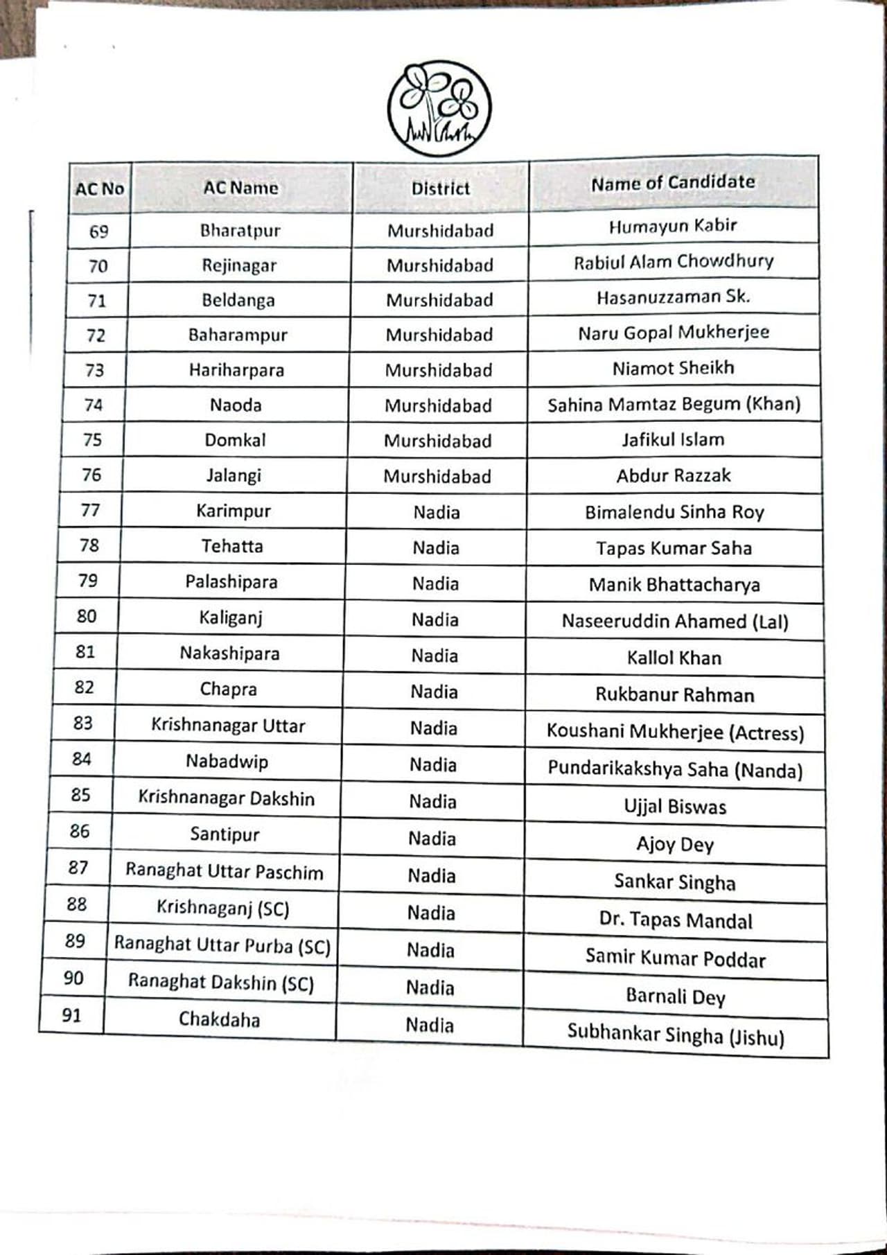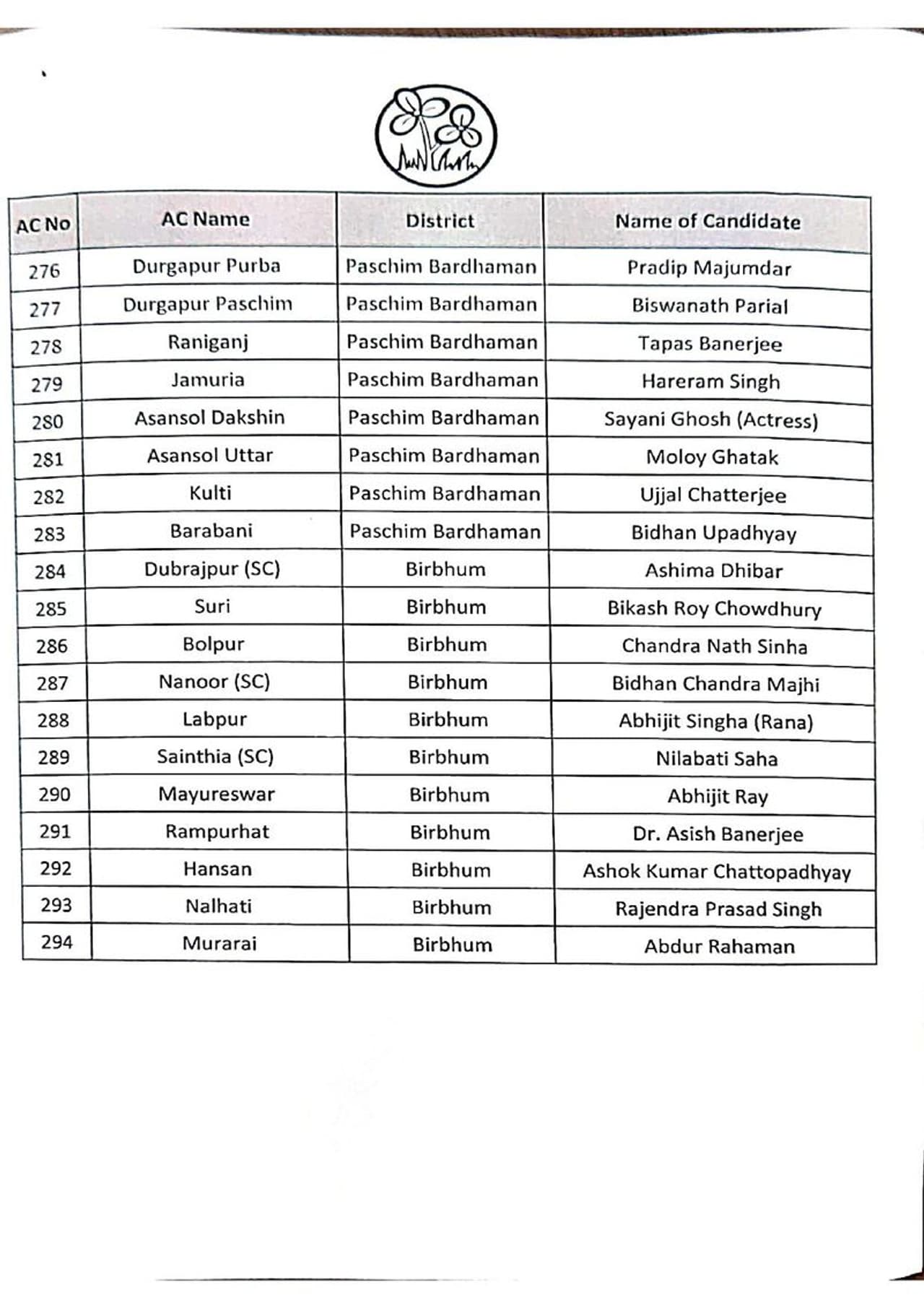 তৃণমূল কংগ্রেসের সম্পূর্ণ প্রার্থী তালিকা