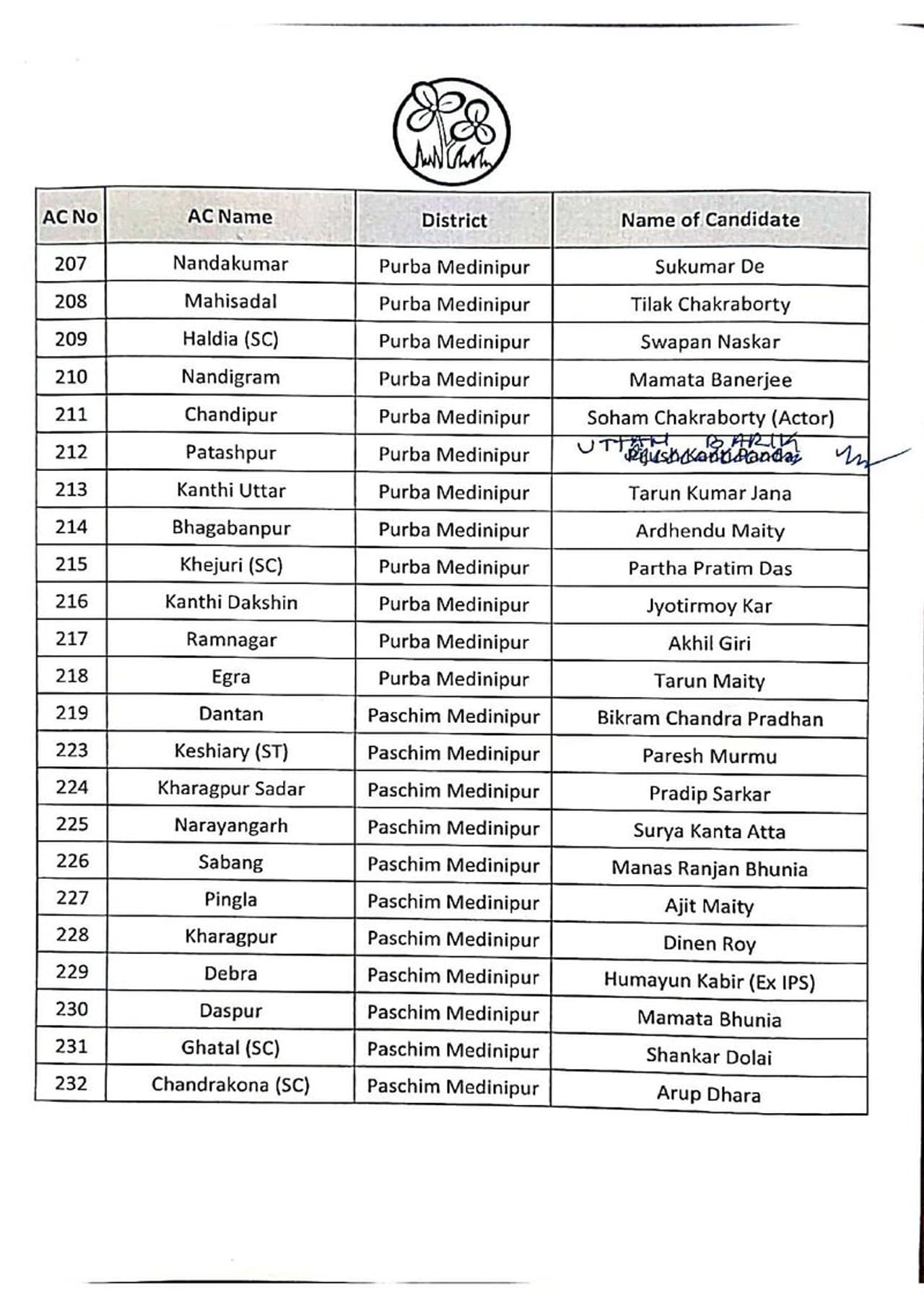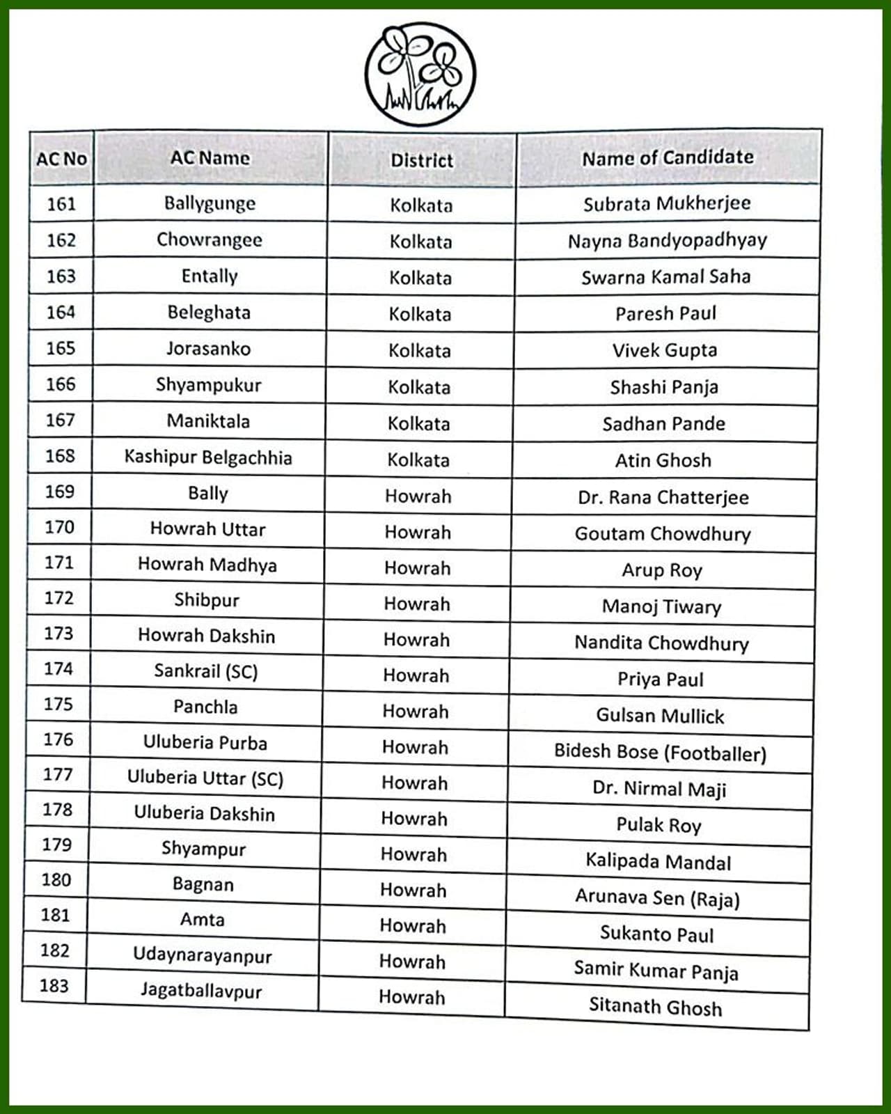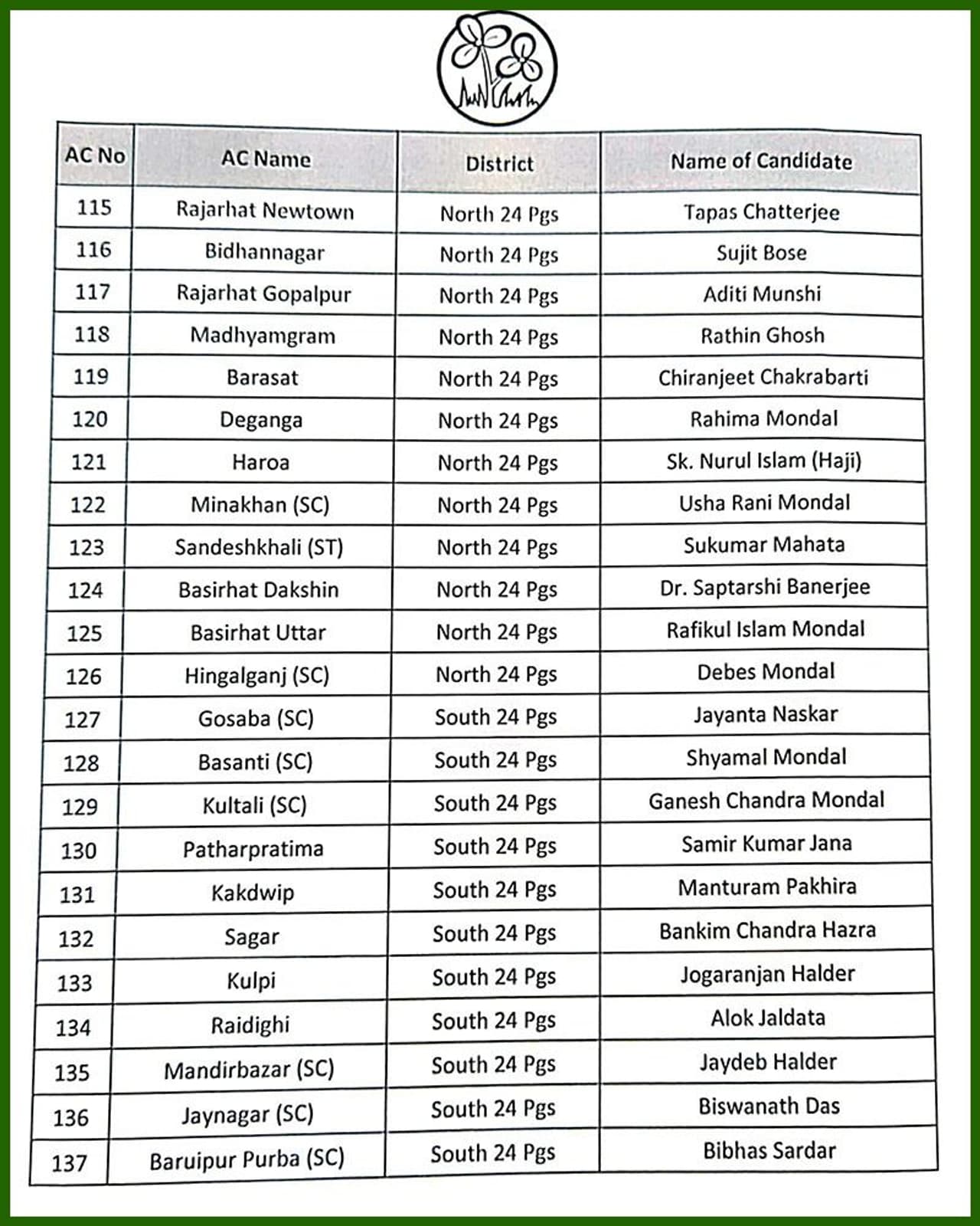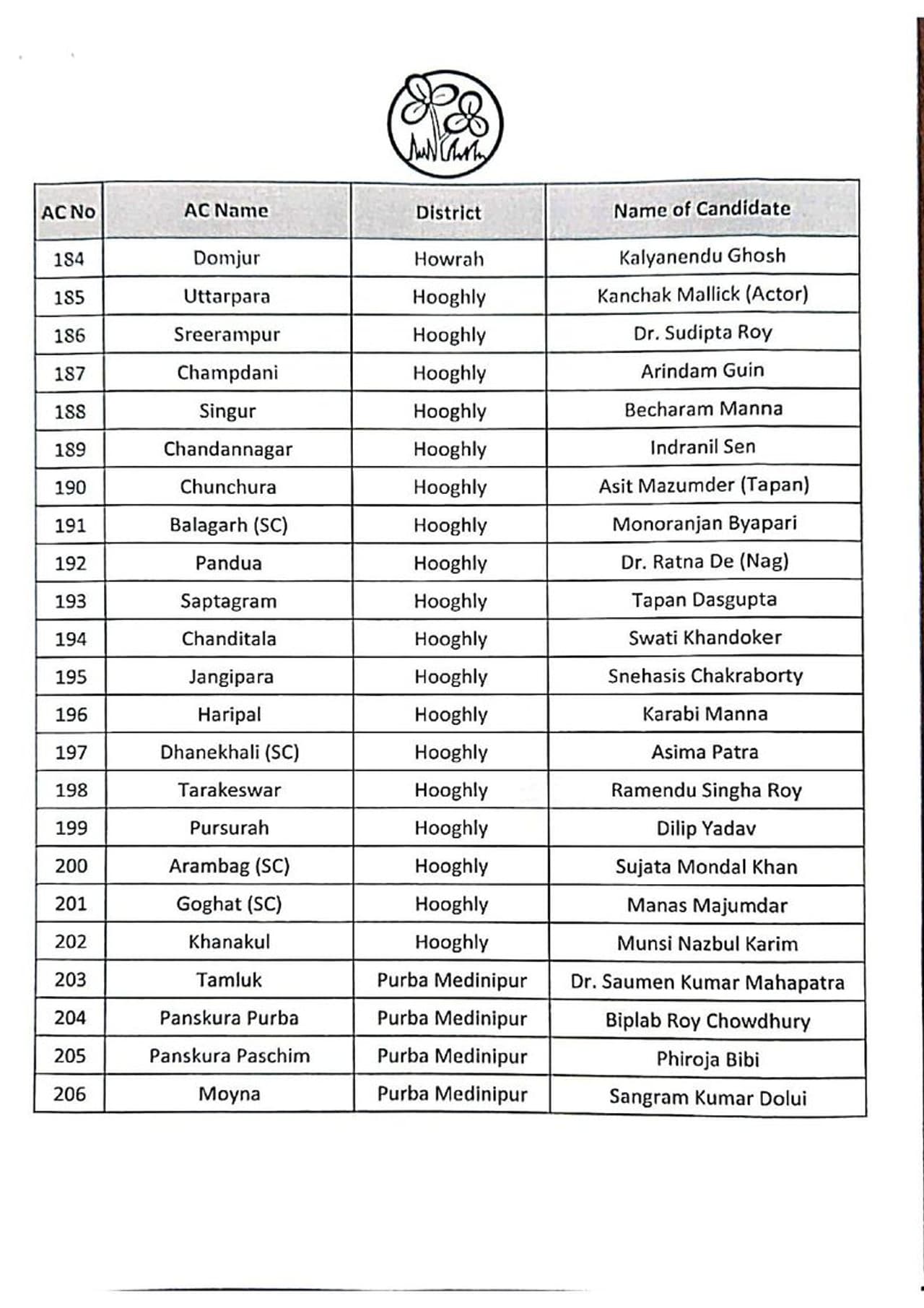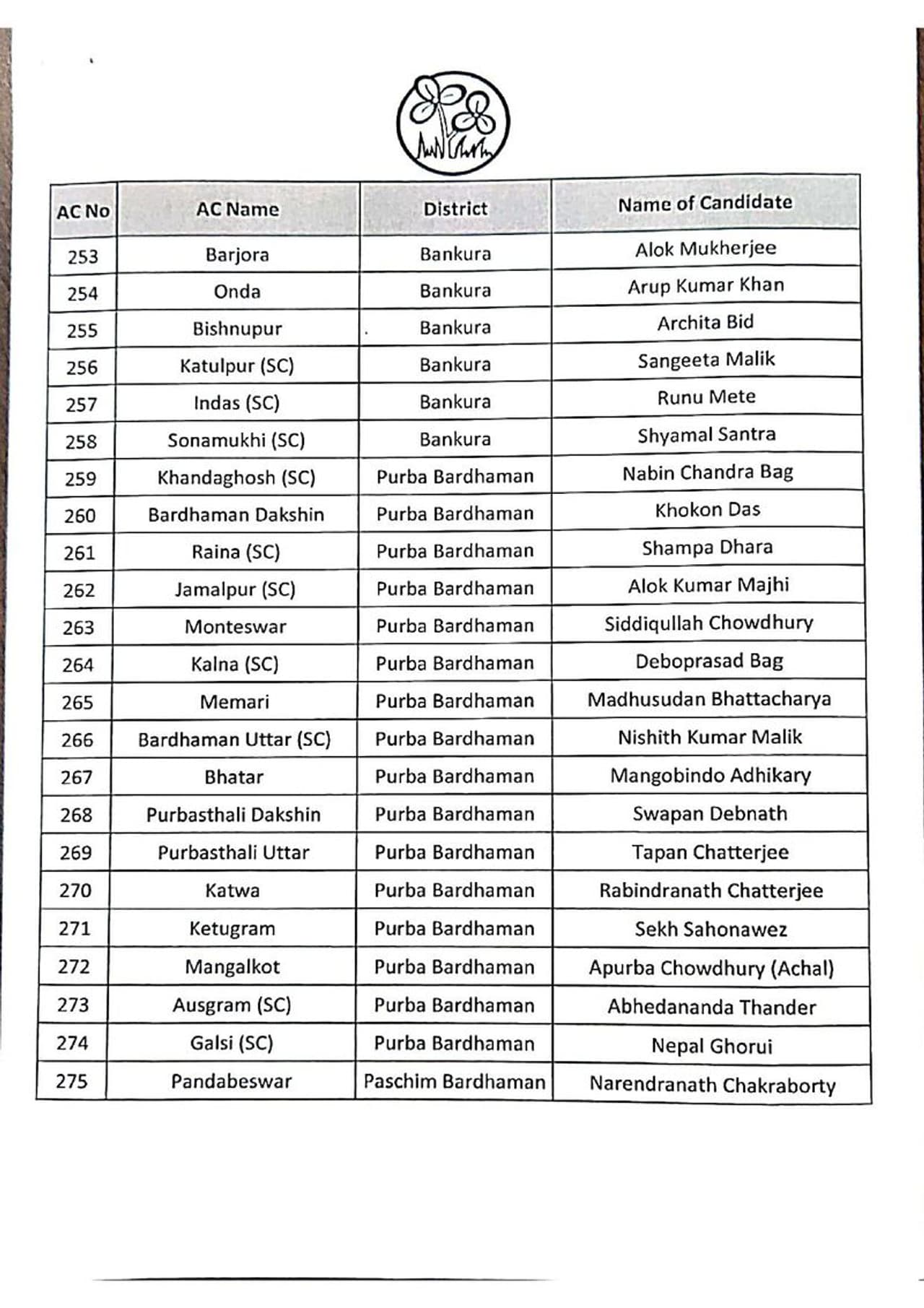 তৃণমূল কংগ্রেসের সম্পূর্ণ প্রার্থী তালিকা
