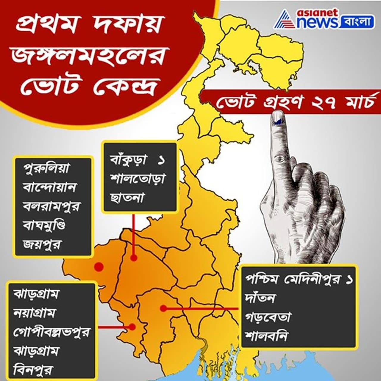 প্রথম দফয়ায় যে ৩০টি কেন্দ্রে ভোট গ্রহণ হবে তারমধ্যে রয়েছে জঙ্গলমহলের ১৪টি কেন্দ্র। গত বিধানসভা নিরিখে এই এলাকায় প্রবল অধিপত্য বিস্তার করেছিল তৃণমূল কংগ্রেস। তুলনায় পিছিয়ে পড়েছিল বামেরা। গত বিধানসভা নির্বাচনে বিজেপি অনেকটাই পিছিয়ে ছিল। কিন্তু বর্তমানে অনেকটাই বদলে গেছে রাজ্যের রাজনৈতিক সমীকরণ। লোকসভা নির্বাচন থেকেই জঙ্গলমহলে মাথা তুলতে শুরু করেছে বিজেপি। বেশ কয়েকটি কেন্দ্রে গেরুয়া শিবির দ্বিতীয় স্থানে ঠেলে দিয়েছে ঘাসফুলকে। তৃণমূল কংগ্রেস আর বিজেপি যখন যুযুধান তখন দলীয় সংগঠন গুছিয়ে নেওয়ার কাজ শুরু করেছে বামেরা। তৃণমূলের দাপটে বন্ধ হয়ে যাওয়া দলীয় অফিস গুলিও খোলা শুরু হয়। তাই বাংলার ভোট মানচিত্রে জঙ্গলমহল বর্তমানে গুরুত্বপূর্ণ হয়ে দাঁড়িয়েছে। এক ঝলকে জঙ্গলমহলের ভোট কেন্দ্রঃ