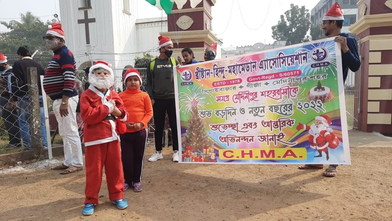 অন্যদিকে মেদিনীপুর শহরের সিপাই বাজার এলাকাতে খ্রিস্টান হিন্দু মহামেডান ক্লাবের পক্ষ থেকে বিশেষভাবে পালন করা হল বড়দিনের সকালটা। রাস্তায় শোভাযাত্রা, পথচারীদের কেক চকলেট বিলি, সেইসঙ্গে বৃক্ষরোপণ করা হল ক্লাবের পক্ষ থেকে। সংক্ষেপে এই ক্লাবকে সিএইচএমএ ক্লাব বলা হয়। বছরের প্রতিটি ধর্মের উৎসবে ধর্ম নিরপেক্ষ ভাবে সামিল হন এই ক্লাবের সদস্যরা। বড়দিনেও সকাল থেকেই উৎসবের আনন্দে মেতে উঠলেন তাঁরা। শনিবার সকালে খুদেদের শান্তা সাজিয়ে এলাকায় শোভাযাত্রা বের করেন। শান্তির প্রতীক হিসেবে শান্তির বেলুন ওড়ান। এরপর রাস্তা দিয়ে যাওয়া বাস, অটো, টোটোতে থাকা যাত্রীদের চকলেট ও কেক বিলি করে শোভাযাত্রায় থাকা খুদে সান্তারা। পরে ব্যাপ্টিস্ট চার্চের সামনে বৃক্ষরোপণ কর্মসূচিতে যোগ দেয় সবাই।