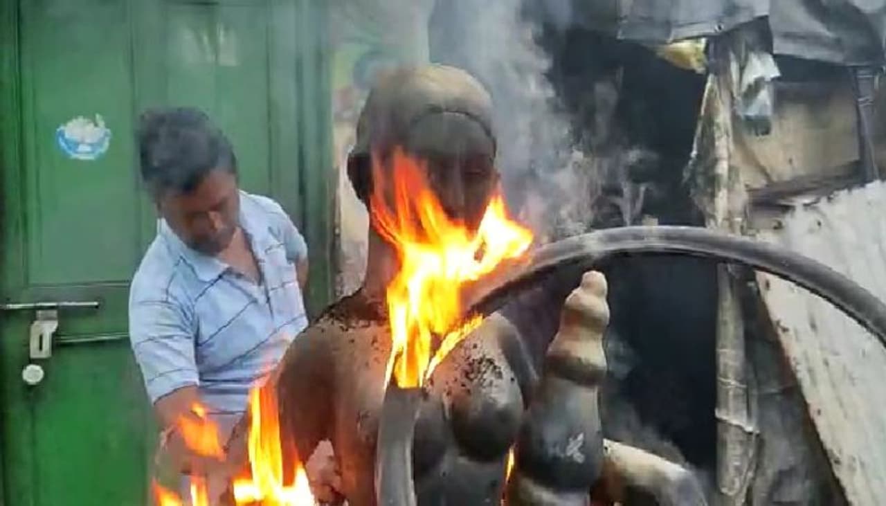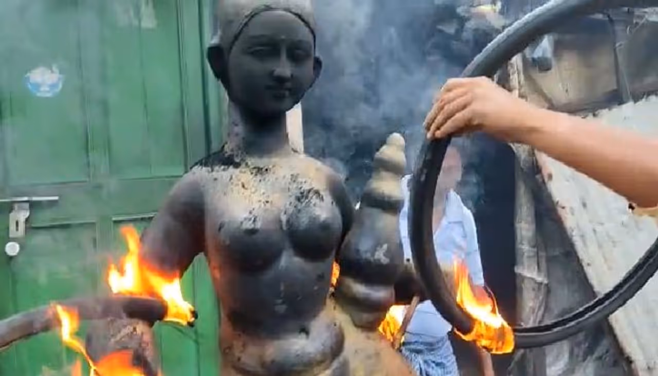 লক্ষী প্রতিমায় (Laxmi Idol) সাইকেলের টায়ার (Bicycle tires) জ্বালিয়ে দেওয়া হচ্ছে আগুন (Fire)। মা লক্ষীর মূর্তির পা থেকে থেকে মাথা পর্যন্ত আগুন লাগিয়ে দেওয়ায়(set on fire) দাউ দাউ করে জ্বলছে মূর্তি। মুহূর্তে মা লক্ষ্মী আগুনের তাপে কালো খাঁক হয়ে যাচ্ছে। আজকের দিনে এই দৃশ্য দেখে অন্য কিছু মনে হতেই পারে। কিন্তু বিষয়টি সেরকম কিছুই নয়।