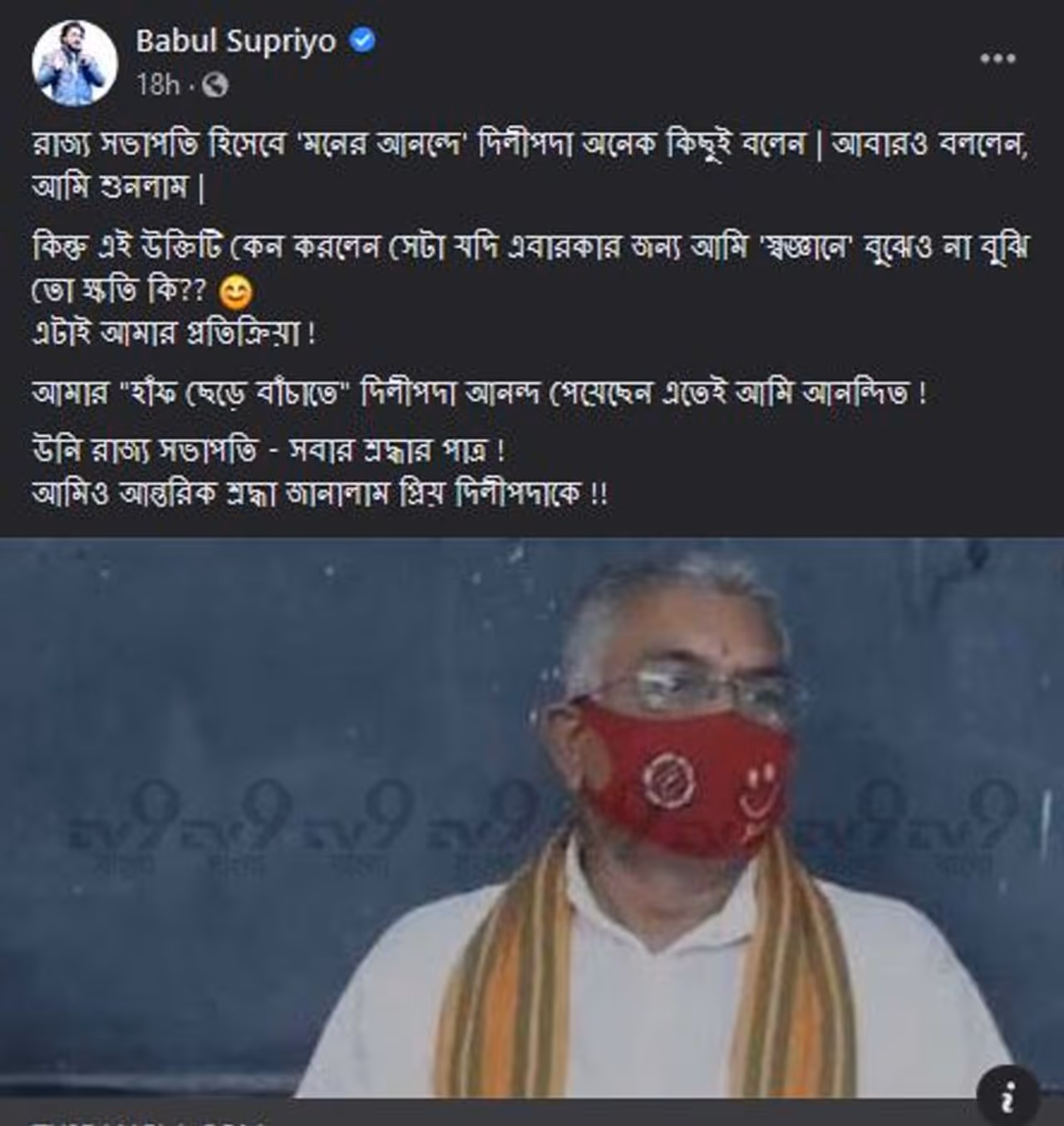 শুক্রবার প্রায় মধ্যরাতে ওই দিলীপ ঘোষের ওই মন্তব্যের একটি সংবাদ প্রতিবেদন তুলে ধরে বাবুল সুপ্রিয়ো ফেসবুকে জবাব দেন। বাবুল লেখেন, 'রাজ্য সভাপতি হিসেবে 'মনের আনন্দে' দিলীপদা অনেক কিছুই বলেন। আবারও বললেন, আমি শুনলাম। কিন্তু এই উক্তিটি কেন করলেন সেটা যদি এবারকার জন্য আমি 'স্বজ্ঞানে' বুঝেও না বুঝি তো ক্ষতি কি? এটাই আমার প্রতিক্রিয়া! আমার "হাঁফ ছেড়ে বাঁচাতে" দিলীপদা আনন্দ পেয়েছেন এতেই আমি আনন্দিত! উনি রাজ্য সভাপতি - সবার শ্রদ্ধার পাত্র! আমিও আন্তরিক শ্রদ্ধা জানালাম প্রিয় দিলীপদাকে!'