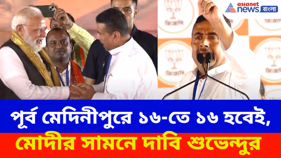 হলদিয়ার জনসভায় দাঁড়িয়ে প্রধানমন্ত্রী নরেন্দ্র মোদীকে আশ্বস্ত করে শুভেন্দু অধিকারী বললেন, এবার পূর্ব মেদিনীপুরের সব কটি আসনেই জিতবে বিজেপি। শুভেন্দু বলেন, 'গত লোকসভায় এখানে তিনটি লোকসভাতেই আমরা জিতেছিলাম, এবার বিধানসভায় ১৬টি-র মধ্যে ১৬টিতেই জিতব। শুভেন্দুর এই কথা শুনে চওড়া হাসি দেখা যায় প্রধানমন্ত্রী মোদীর মুখে।