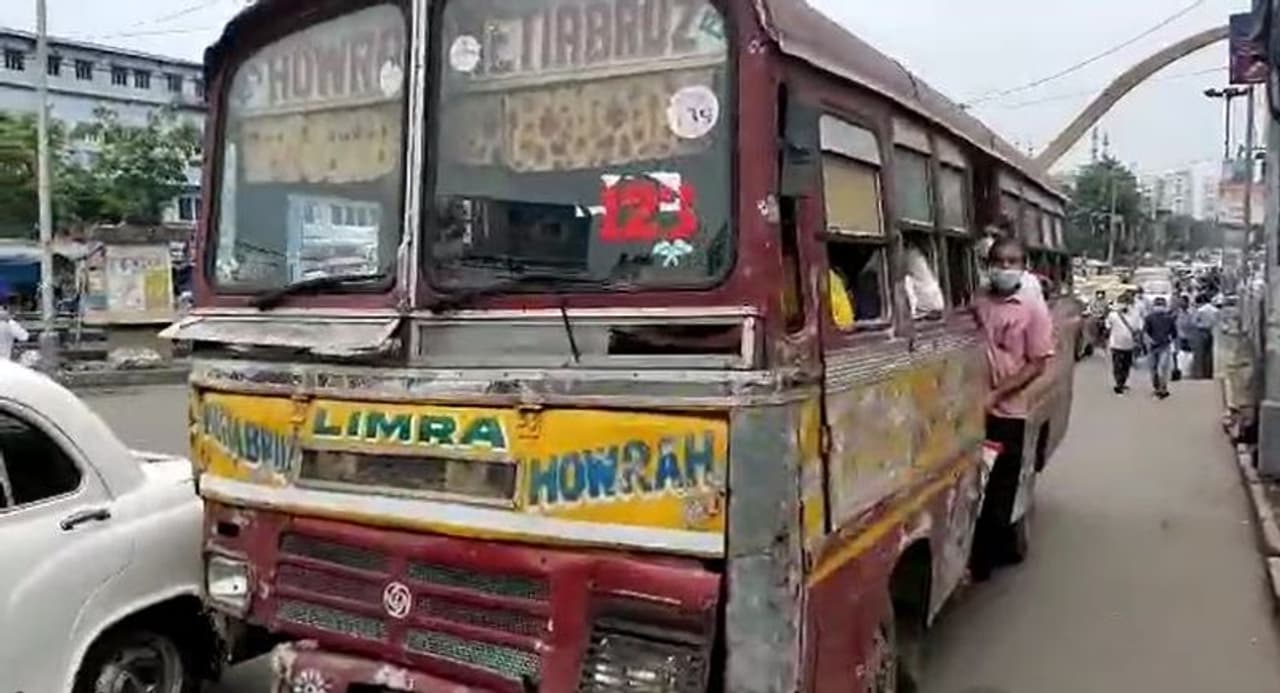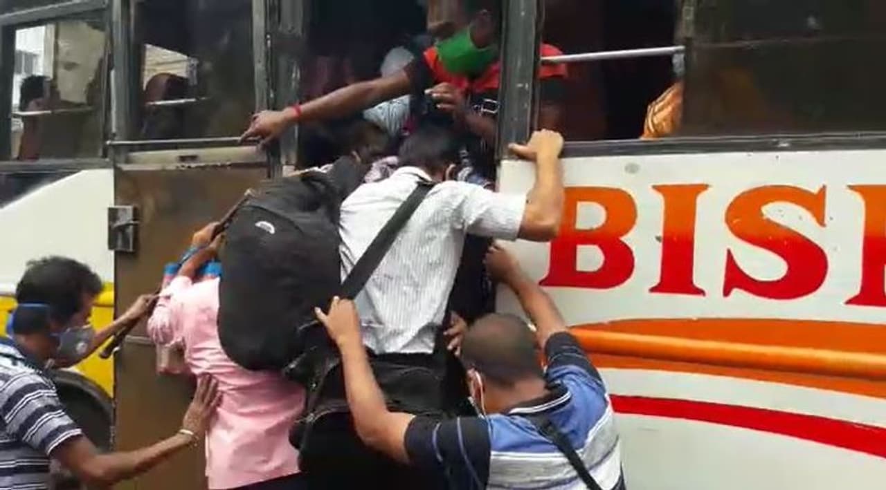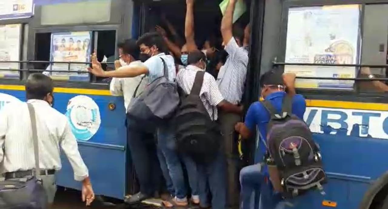 বাস চালুর অনুমতি দিয়েছিলেন মুখ্যমন্ত্রী সকাল থেকেই শুরু হয়েছে বাস পরিষেবা রাস্তায় বাসের সংখ্যা খুবই কম তিল ধারণের জায়গা নেই বাসগুলিতে