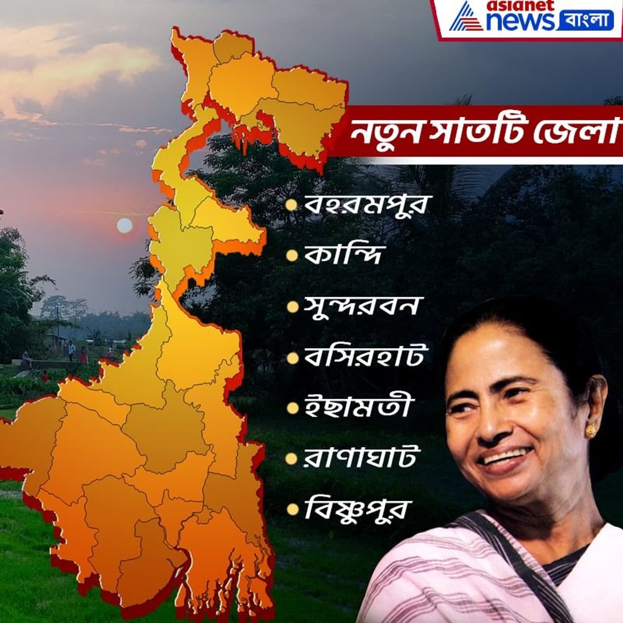 পশ্চিমবঙ্গের মানচিত্রে আরও সাতটি জেলা জুড়তে চলেছে। সোমবার নবান্নে মন্ত্রিসভার বৈঠতেক পর মুখ্যমন্ত্রী মমতা বন্দ্যোপাধ্যায় নতুন সাতটি জেলার নাম ঘোষণা করেছেন। যে নতুন সাতটি জেলা হবে সেগুলি হল বহরমপুর, কান্দি, সুন্দরবন, বসিরহাট, ইছামতী, রাণাঘাট ও বিষ্ণুপুর। এই জেলাগুলির মধ্যে আথে থেকেই সুন্দরবন, বসিরহাট, রানাঘাটকে পুলিশ জেলা হিসেবে ঘোষণা করে কাজ শুরু হয়েছিয়স। আয়তনে উত্তর ও দক্ষিণ ২৪ পরগনা যথেষ্ট বড়। আর সেই কারণে এই দুই জেলাকে ছোট ছোট করে ভাগ করা হচ্ছে। মূলত প্রশাসনিককাজের সুবিধের জন্যই এই পদক্ষেপ গ্রহণ করা হয়েছে বলেও নবান্ন সূত্রের খবর।
