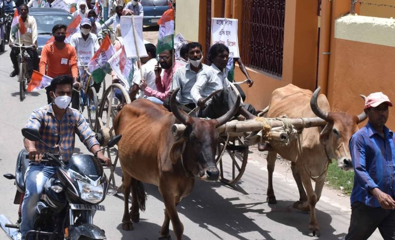 প্রতি দু-একদিন অন্তরই বাড়ছে পেট্রোল ও ডিজেলের দাম। রাজ্যে পেট্রোলের দাম ১০০ ছাড়িয়ে গিয়েছে। পেট্রোপণ্যের মূল্যবৃদ্ধির প্রভাব পড়ছে খাদ্য সামগ্রীর উপর। ফলে খাদ্য সামগ্রীর দামও বেড়ে চলেছে। পেট্রোপণ্যের মূল্যবৃদ্ধির প্রতিবাদে সরব হয়েছেন বিরোধীরা। রাজ্যের বিভিন্ন জায়গায় প্রায় প্রতিদিনই বিক্ষোভ দেখাচ্ছেন তৃণমূল নেতা-কর্মীরা। আর এবার পেট্রোল, ডিজেল ও জ্বালানি গ্যাসের মূল্যবৃদ্ধির প্রতিবাদে সরব হয়েছে কংগ্রেস। সাইকেলে চালিয়ে ও গরুর গাড়িতে চেপে পুরুলিয়া জুড়ে অভিনব পদ্ধতিতে প্রতিবাদ দেখাচ্ছেন তাঁরা। এই প্রতিবাদ কর্মসূচির নেতৃত্ব দিচ্ছেন পুরুলিয়া জেলা কংগ্রেস সভাপতি তথা বাগমুন্ডির প্রাক্তন বিধায়ক নেপাল মাহাত।