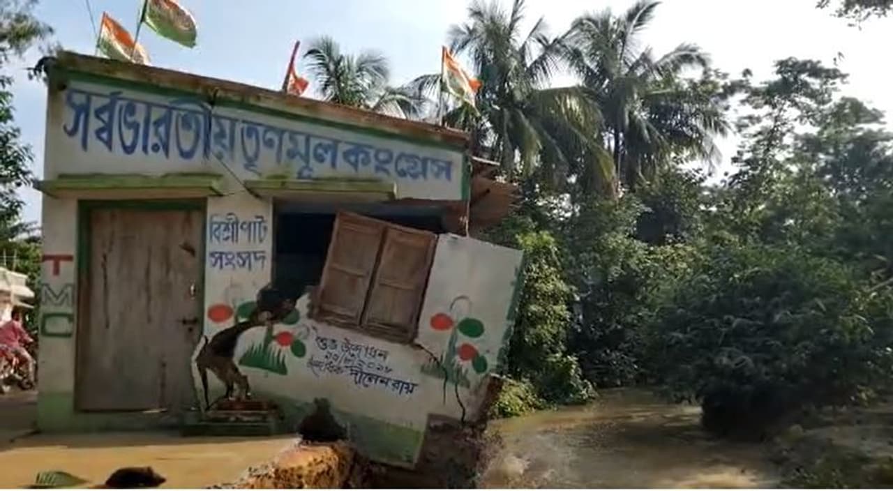 ইটের দেওয়াল দেওয়া ওই কার্যালয়টি স্থানীয় জলের ক্যানেলের পাশে তৈরি করা হয়েছিল। স্থানীয়রা জানান, প্রবল বর্ষণে বৃষ্টির জল গ্রামের বিভিন্ন এলাকায় ঢুকে পড়ে। এমনকী জল উপচে পড়ে ওই ক্যানেলেও। এদিকে জল বেড়ে যাওয়ার ফলে ধীরে ধীরে সেই ক্যানালের মাটি ধুয়ে যেতে শুরু করে।