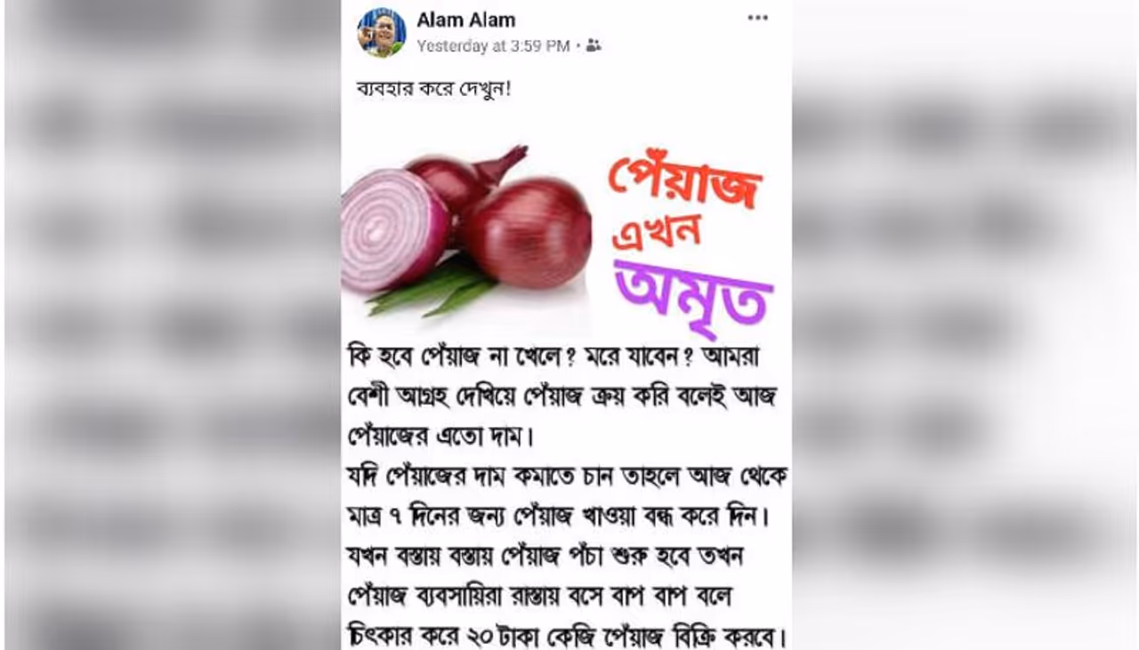 কিন্তু অনেকেই কম পরিমাণ পিঁয়াজ কিনছেন। কিন্তু তাতেও তো দাম কমার কোনও লক্ষণই নেই। তাহলে পিঁয়াজ বয়কট করলে কীভাবে দাম কমবে? অভিনব পদ্ধতি বের করেছেন নেটিজেনরা। তাঁদের যুক্তি, সাতদিন যদি কেউ পিঁয়াজ না কেনেন, তাহলে বিক্রেতার ঘরে বস্তাবন্দি পিঁয়াজ পচতে শুরু করবে। তখন কম দামে বিক্রি করা ছাড়া আর কোনও উপায় থাকবে। কেউ কেউ আবার একধাপ এগিয়ে দাবি করেছেন, বাংলাদেশে কোনও এক শহরে নাকি স্রেফ কেনা বন্ধ করে পিঁয়াজের দাম লাগাম পরিয়েছেন স্থানীয় মানুষেরাই! কিন্তু ঘটনা হল, এ রাজ্যের মতোই বাংলাদেশেও পিঁয়াজের দাম আকাশ ছুঁয়েছে।