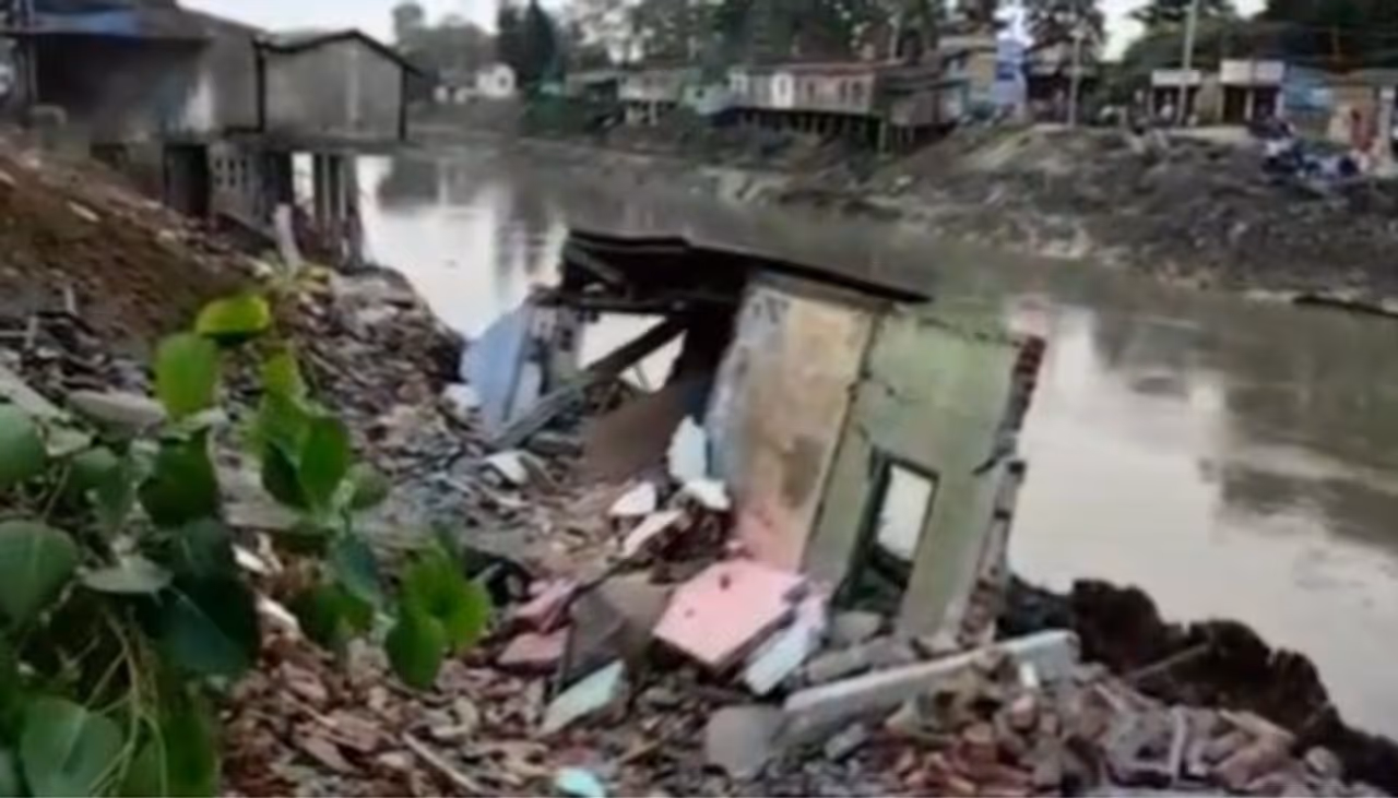 দূর্বাচটি খালের সংস্কার শুরু হয়েছিল পাড়ে থাকা দোকানিদের সরে যাওয়ার নির্দেশ প্রবল বৃষ্টিতে নদীপাড়ের মাটি আলগা হতে শুরু করেছে ক্রমশ ধ্বসে পড়ছে একের পর এক দোকান ঘর