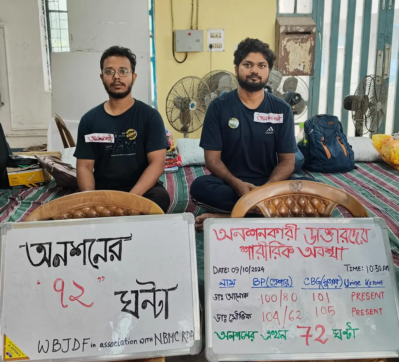 এবার আন্দোলনের এক বিশেষ কর্মসূচি গ্রহণ করবেন জুনিয়র ডাক্তাররা। এদিকে অনশন মঞ্চে আজও অভুক্ত অবস্থায় রয়েছেন তাঁরা। দাবি না মেটা পর্যন্ত চলবে অনশন। শরীর ক্রমশ দুর্বল হয়েছে। কিন্তু মনের অদম্য জেদে চলছে অনশন।