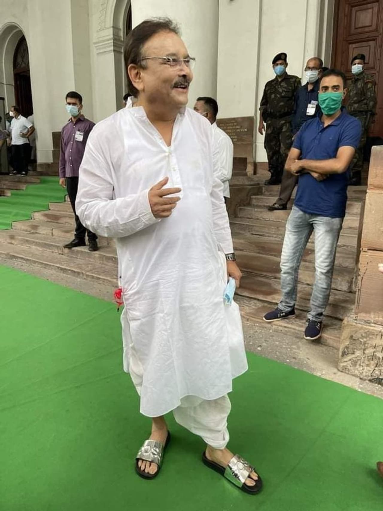 পাঁচ বছর পর বিধানসভায় ফিরেছেন মদন মিত্র একই মেজাজে দেখা গেল তাঁকে পরনে ছিল সাদা ধুতি-পঞ্জাবি ও নীল মাস্ক নজর কাড়ল তাঁর রুপোলি চপ্পল