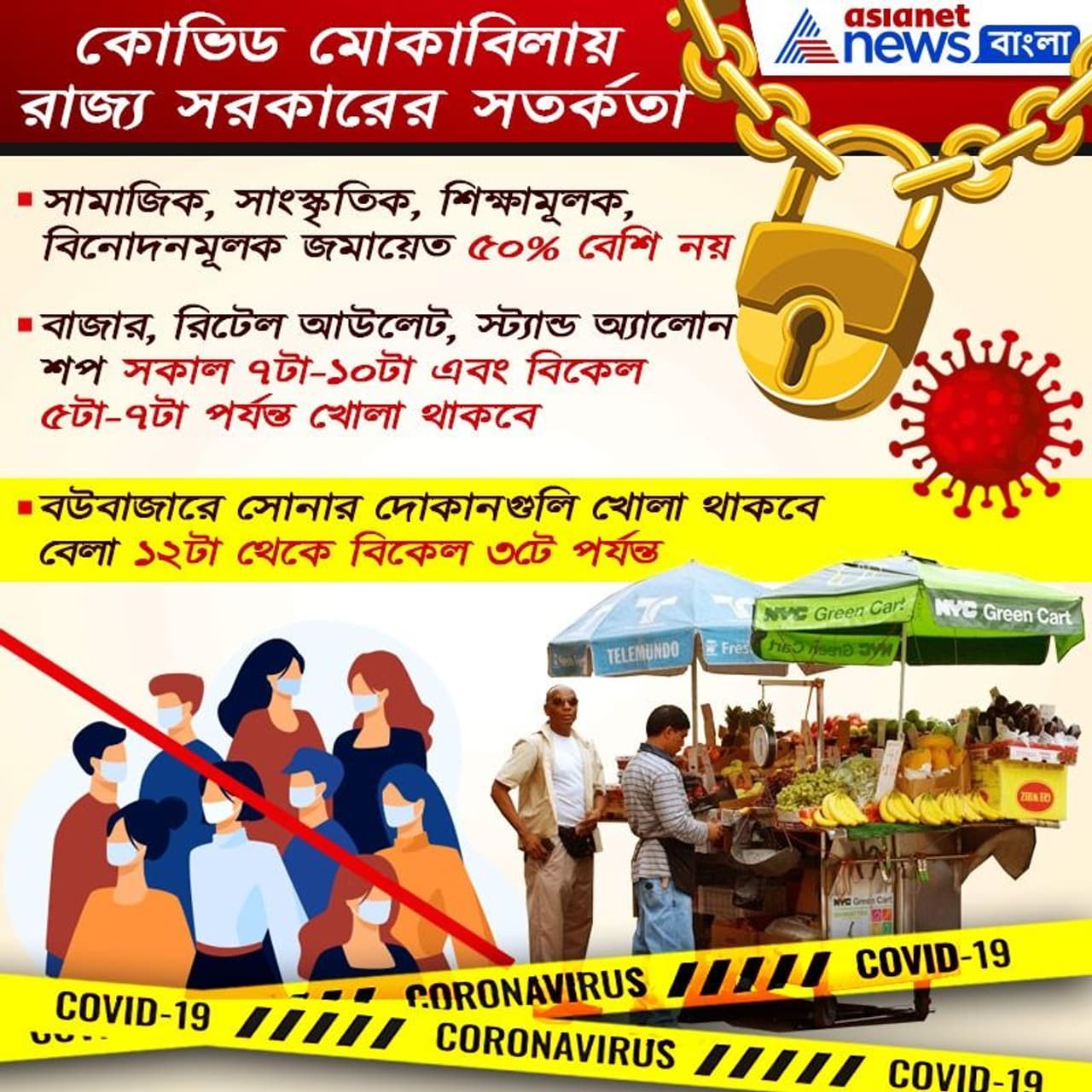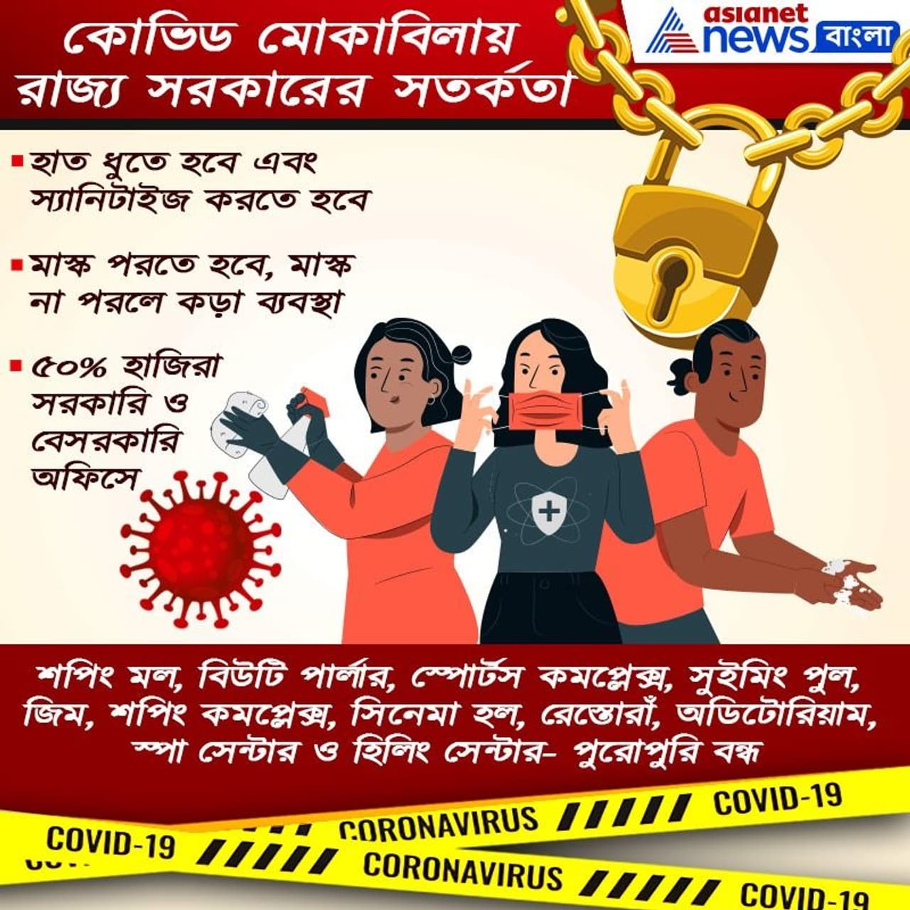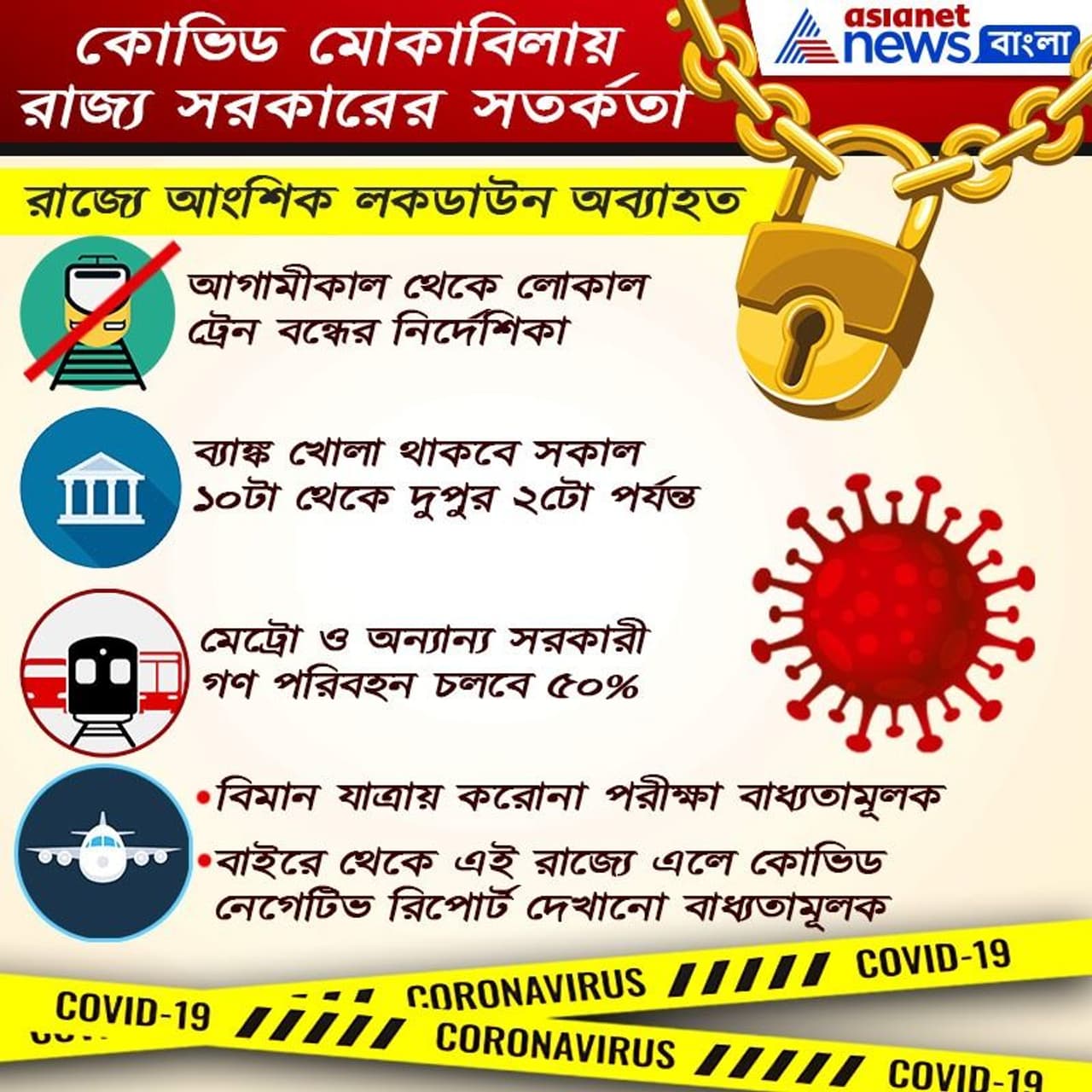 এরই সঙ্গে কী কী নিয়ম মেনে চলতে হবে, তার পূর্ণাঙ্গ তালিকা প্রকাশ করা হয়েছে। মমতা বন্দ্যোপাধ্যায় জানিয়েছেন রাজ্যে লোকাল ট্রেন চলবে না। আংশিক লকডাউন সব এলাকায় জারি করা থাকবে। ব্যাংক, মেট্রো ও সরকারি-বেসরকারি যানবাহনের জন্য জারি করা হয়েছে বিশেষ নির্দেশিকা।