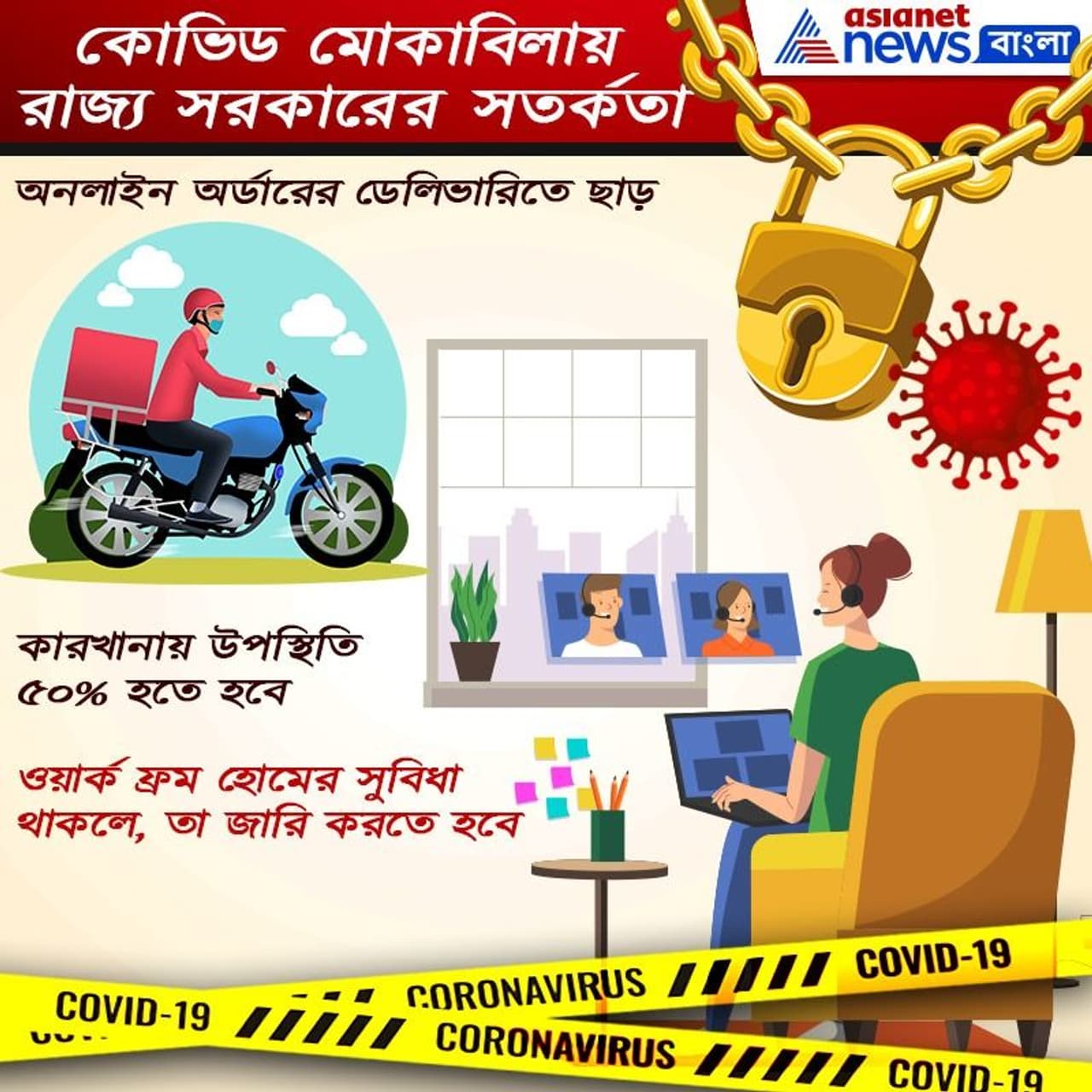 ১৮। শিল্প-কলকারখানা, কাঠ চেরাই-এর কল-এ ৫০ শতাংশ উপস্থিতি। বাকিদের ওয়ার্ক ফ্রম হোম