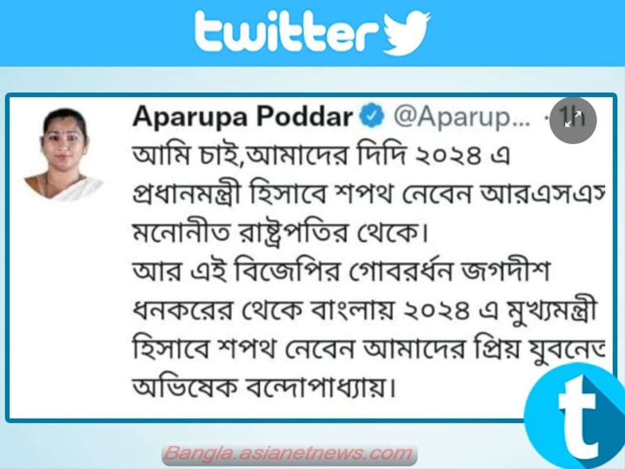 অপরূপার টুইট- কুণাল ঘোষের এই টুইটের ২৪ ঘণ্টা যেতে না যেতেই সোশ্যাল মিডিয়ায় বার্তা দেন দলের সাংসদ অপরূপা পোদ্দার। তিনি লেখেন, ২০২৪ সালে মমতা বন্দ্যোপাধ্যায় দেশের প্রধানমন্ত্রী হবেন। আর রাজ্যের মুখ্যমন্ত্রী হিসেবে অভিষেক বন্দ্যোপাধ্যায়কে শপথবাক্য পাঠ করাবেন রাজ্যপাল জগদীপ ধনখড়। যদিও তিনি রাজ্যপালের নাম বিকৃত করেছেন। যাইহোক এই টুইট নিয়ে রীতিমত সরগরম হয় রাজ্যরাজনীতি। তিনি টুইট করার এক ঘণ্টা পরে পোস্টটি সরিয়েও ফেলেন। তবে বিতর্ক থামেনি।