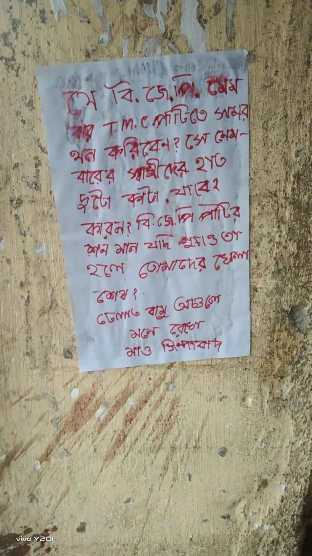 এই পোস্টারে বিজেপি-তৃণমূলের আঁতাঁতের বিরুদ্ধে কড়া বার্তা দেওয়া হয়েছে। তাই এর পিছনে বড় কোনও রাজনৈতিক কারণ রয়েছে বলে মনে করছেন রাজনৈতিক মহলের একাংশ। পোস্টারে লাল কালীতে লেখা, "যে বিজেপি মেম্বার টিএমসি পার্টিকে সমর্থন করবেন, সেই মেম্বারের স্বামীদের হাত দুটো কাটা যাবে। কারণ, বিজেপি পার্টির সম্মান যদি ঘুচাও, তাহলে তোমাদের খেলা শেষ। ধেলাত বামু অঞ্চল মনে রেখো, মাও জিন্দাবাদ।"