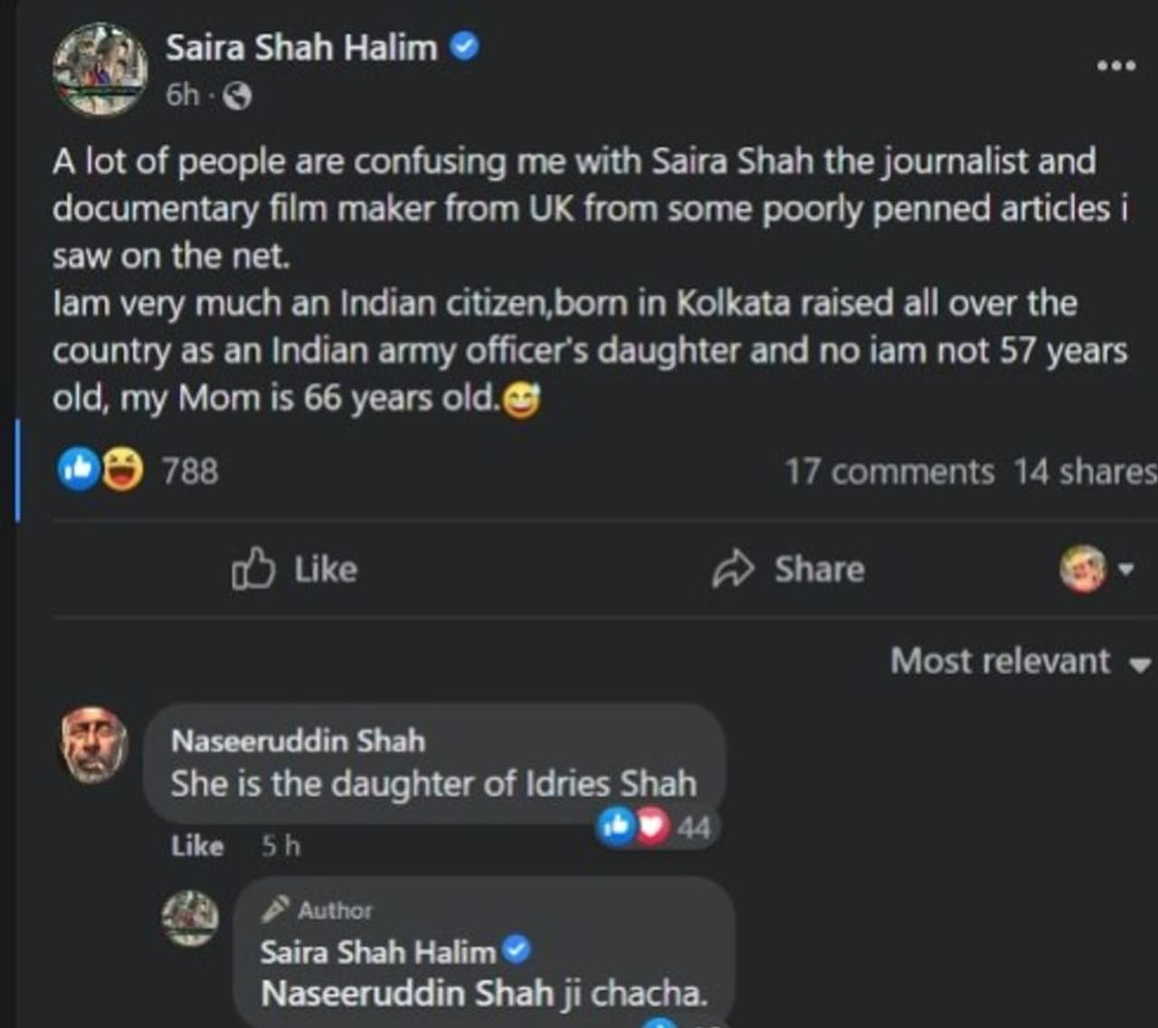 এরপর নিজের বয়স সম্পর্কে যে ভুল তথ্য প্রকাশ করা হচ্ছে সেই বিষয়ে মুখ খুলেছেন সায়রা শাহ হালিম। তিনি লিখেছেন 'আরও একটি কথা জানিয়ে রাখা দরকার যে আমার বয়স মোটেও ৫৭ বছর নয়, আমার বয়স ৬৬ বছর।' আর সায়রার এই পোস্টেই তাঁর পাশে দাঁড়িয়েছেন তার কাকা নাসিরুদ্দিন শাহ। সায়রার সমর্থনে তিনি লিখেছেন 'সায়রা শাহ হালিম হল ইদ্রিস শাহের মেয়ে।' এরপর কাকার কমেন্টের জবাব দিয়ে সায়রা লেখেন, 'হ্যাঁ কাকা।' প্রসঙ্গত, উপনির্বাচনের আর এক কেন্দ্র আসানসোলের তৃণমূল প্রার্থী হিসাবে বেছে নেওয়া হয়েছে বলিউডের জনপ্রিয় অভিনেতা শত্রুঘ্ন সিনহাকে। আর এক্ষেত্রে ও উঠতে শুরু করেছে বাঙালি- অবাঙালি বিতর্ক। যদিও শাসক দলের দাবি 'লোকসভা নির্বাচনের ক্ষেত্রে এই ধরণের তত্ত্ব কাজ করে না।'