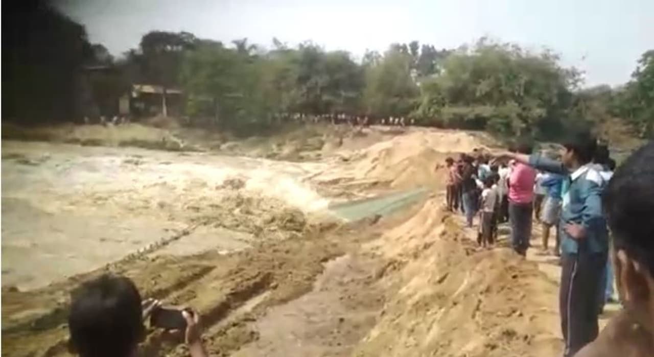 স্থানীয়দের অভিযোগ, নদীর জলস্তর কয়েকদিন ধরেই বাড়ছিল। এছাড়া বাঁধের নির্মাণকাজও একেবারেই ভালো হয়নি। মাটি ও বাঁশের পরিমাণ কম দিয়েছিল ঠিকাদার। তার জেরেই জলের চাপ আর বাঁধটি ধরে রাখতে পারেনি। জলের চাপে আজ সকালেই তা হুড়মুড়িয়ে ভেঙে পড়ে।
