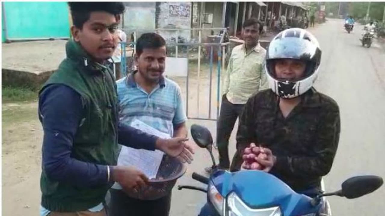 নিয়ম মেনে বাইক আরোহীদের হাতে পেঁয়াজ তুলে দিয়ে ক্লাবের সদস্যরা বলেন, 'হেলমেট পরুন, অন্যকেও পরতে বলুন। তাতে জীবন বাঁচবে। সঙ্গে উপরি পাওনা এই পেঁয়াজ।'