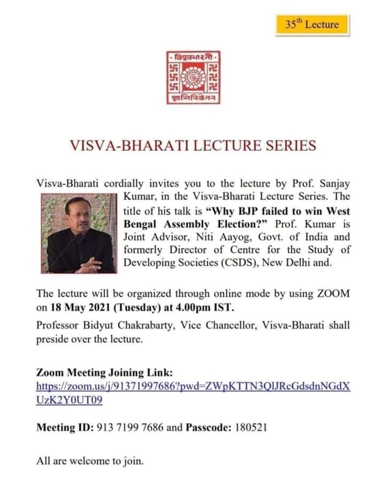 "কেন বিজেপি রাজ্যে বিধানসভা নির্বাচনে ব্যর্থ"? ১৮ মে এই বিষয় নিয়ে বিশ্বভারতীতে অনলাইন আলোচনা সভার বিজ্ঞপ্তি জারি করেন উপাচার্য বিদ্যুৎ চক্রবর্তী। আলোচনায় অংশগ্রহণ করার কথা কেন্দ্রীয় সরকারের নীতি আয়োগের যুগ্ম পরামর্শদাতা অধ্যপক সঞ্জয় কুমারের। এই আয়োজন ঘিরেই বিতর্ক তৈরি হয়েছে। নিন্দার ঝড় উঠেছে শান্তিনিকেতনে। নিন্দায় সরব সুপ্রিয় ঠাকুর থেকে শুরু করে পড়ুয়ারা।