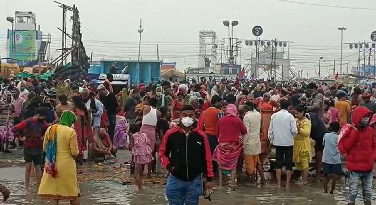 কিন্তু, ভোর রাত থেকে সতর্কতার ছবি একেবারেই উধাও হয়ে গিয়েছে গঙ্গাসাগরে। ভোরের আলো ফোটার আগে রাত থেকেই স্নান শুরু করে দেন বহু পুণ্যার্থী। আর ভোরের দিকে সমুদ্র সৈকতে আরও বাড়তে থাকে ভিড়। ক্রমশ সেই ভিড় বেড়েই চলেছে। আর ওই বিপুল পরিমাণ পুণ্যার্থীকে সামাল দিতে গিয়ে রীতিমতো নাজেহাল অবস্থা পুলিশ প্রশাসনের। কার্যত সকাল থেকেই করোনাবিধি তোয়াক্কা না করেই চলছে পুণ্যস্নান।