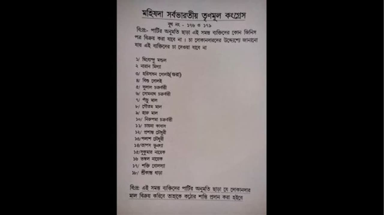 কী আছে সেই লিফলেটে? মহিষদা গ্রামের বাসিন্দা বিজেপির ১৮ জন কর্মী-সমর্থকের পরিবারের নামে ফরমান জারি করা হয়েছে। তৃণমূল কংগ্রেস দলের অনুমতি ছাড়া এই ব্যাক্তিবর্গকে কোনও দোকানের কোনও পণ্য বিক্রি করতে পারবে না। চা দোকানেও চা-ও বিক্রি করা চলবে না। দলের বিনা অনুমতিতে যদি এদেরকে কেউ কিছু বিক্রি করে, তাহলে তার বিরুদ্ধে শাস্তিমূলক ব্যবস্থা গ্রহন করা হবে , বিতর্কিত লিফলেটটিতে এমনটাই জানানো হয়েছে।