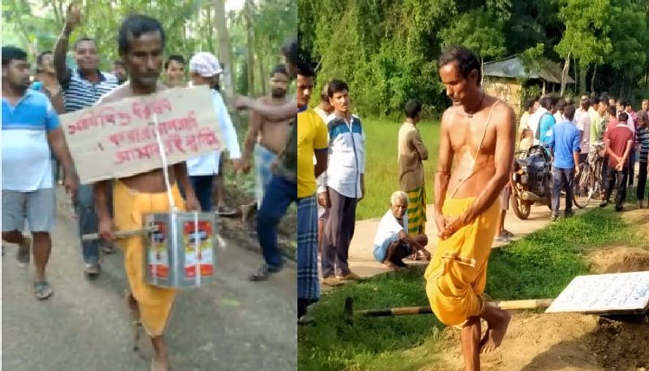 নাবালিকার শ্লীলতাহানির অপরাধ গলায় প্ল্যাকার্ড ও টিন ঝুলিয়ে ঘোরানো হলো পুরোহিতকে ভিডিও ভাইরাল হওয়ায় তদন্তে নামে পুলিশ গ্রেফতার করা হয় ওই অভিযুক্তকে