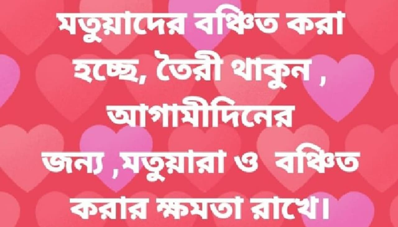 এদিকে, তৃণমূলের কাছ থেকেও কোনও সুযোগ সুবিধা পাননি বিজেপিরা (BJP)। তৃণমূল তাদের কথা চিন্তা করেননি। দুই দল থেকে সমর্থন না পেয়ে কার্যত এমন সিদ্ধান্ত নিয়েছে মতুয়ারা। রাজনৈতিকবিদদের মতে, মানুষের সমর্থন পেতেই মতুয়ারা নতুন সিদ্ধান্ত নিয়েছেন। কোনও রাজনৈতিক দলের সঙ্গে না থাকার সিদ্ধান্তের কথা জানিয়েছেন তারা। এক কারণ, মতুয়ারা নিজেদের ভোট ব্যাঙ্ক (Vote Bank) হাতছাড়া করতে রাজি নন। আর এই কারণেই এই সিদ্ধান্ত নিয়েছেন তারা। এই প্রসঙ্গে অল ইন্ডিয়া মতুয়া মহাসঙ্ঘের সাধারণ সম্পাদক সুখেন্দ্র নাথ গাইন বলেন, পোস্টটি আমাদের সম্পূর্ণ ব্যক্তিগত মতামত। আমরা মোট ১১ দফা দাবি নিয়ে বিজেপিকে সমর্থন করেছিলান। কিন্তু, এখনও পর্যন্ত তার একটাও পূরণ হয়নি। মতুয়ারা বঞ্চিত হচ্ছে। সাংগঠনিক ক্ষেত্রেও তাদের যোগ্য নেতৃত্বকে সম্মান দেওয়া হয়নি।