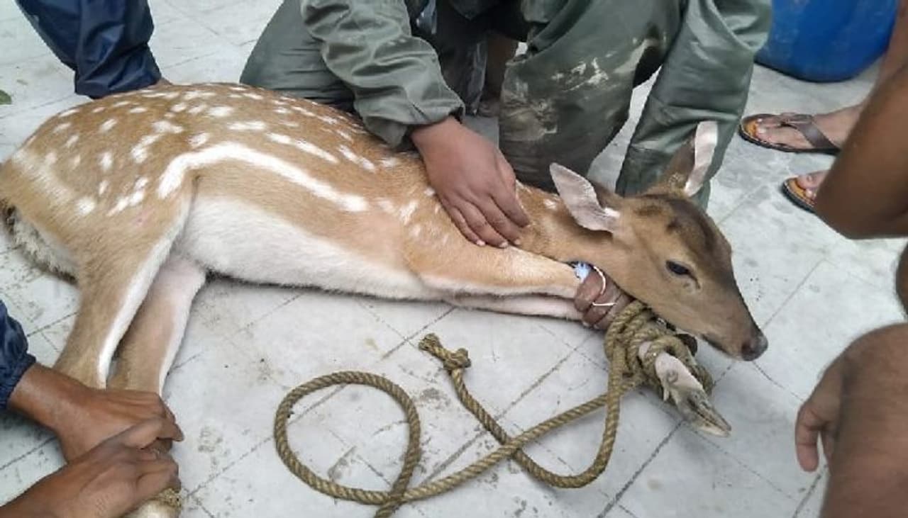 হরিণ ভেসে এল লোকালয়ে উদ্ধার করলো গোসাবা থানার টিম গোসাবার পাখীরালয়ে দেখা গেল হরিণটিকে ফরেস্ট রেঞ্জারের হাতে তুলে দেওয়া হয়