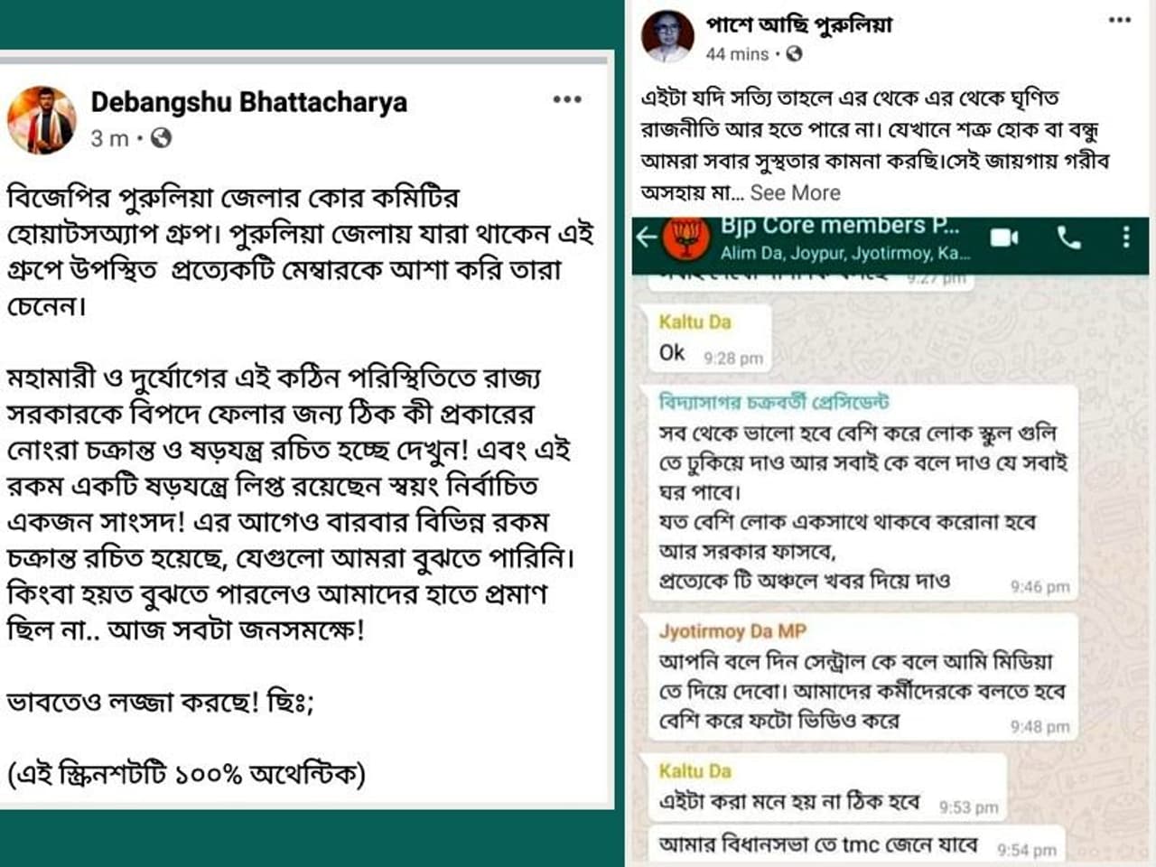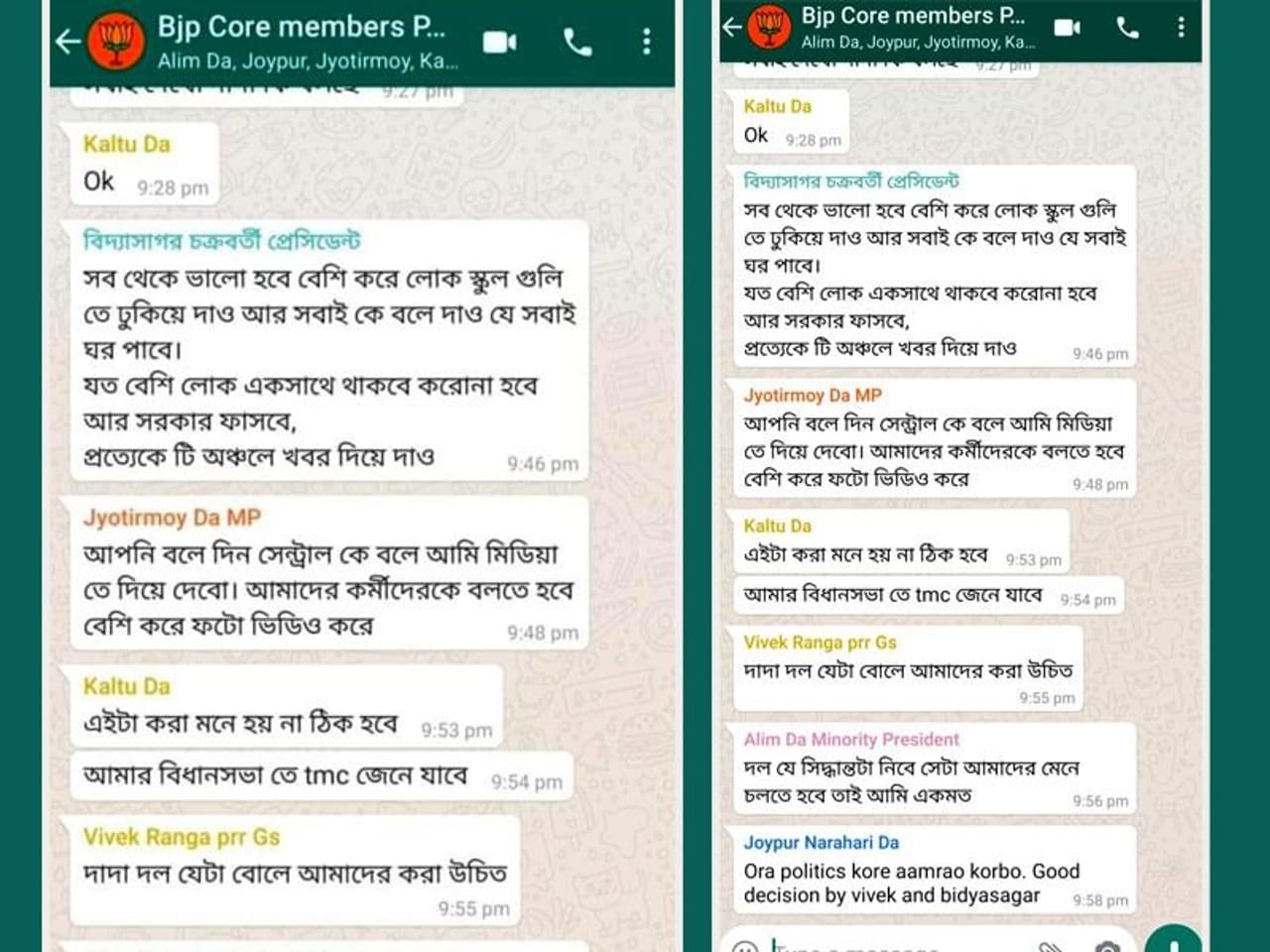ভাইরাল হওয়া স্ক্রিনশটে কী লেখা রয়েছে একনজরে- শিরোনামে বিজেপি কোর মেম্বার্স পুরুলিয়া। এরপর দেখা যাচ্ছে কয়েক জনের নাম। হোয়াটসঅ্যাপ গ্রুপ ওপেন করলে তাতে সদস্যদের নাম যেভাবে আসে, তেমন কিছু নাম। এরপর ভাইরাল হওয়া স্ক্রিনশটে প্রথমে কাল্টু দা বলে একজনের নাম। যার নামের পাশে লেখা রয়েছে ওকে। এরপর নীল রঙে একজনের নাম। সেই নামটি হচ্ছে বিদ্যাসাগর চক্রবর্তী-প্রেসিডেন্ট। এই নামের নিচে যে লেখাটি রয়েছে তা হুবুহু এরকম- 'সব থেকে ভালো হবে বেশি করে লোক স্কুলগুলিতে ঢুকিয়ে দাও, আর সবাইকে বলে দাও যে সবাই ঘর পাবে। যত বেশি লোক একসাথে থাকবে করোনা হবে আর সরকার ফাঁসবে, প্রত্যেকটা অঞ্চলে খবর দিয়ে দাও।' এই বিদ্যাসাগর চক্রবর্তীর নিচেই এবার একটি নামের উল্লেখ রয়েছে। সেই নামটি হল জ্যোতির্ময়দা এমপি। এই নামের নিচে যে কথাগুলি লেখা রয়েছে তা হল এরকম- 'আপনি বলে দিন সেন্ট্রালকে বলে আমি মিডিয়া তো দিয়ে দেব। আমাদের কর্মীদেরকে বলতে হবে বেশি করে ফটো ভিডিও করে'। এরপর কাল্টু দা নামে একটি ব্যক্তির নামের সঙ্গে লেখা রয়েছে- 'এইটা করা মনে হয় না ঠিক হবে, আমার বিধানসভাতে টিএমসি জেনে যাবে'। বিবেক রাংঙ্গা পিআরআর জিএস বলে একটি নামের উল্লেখ রয়েছে এই ভাইরাল মেসেজে। এই নামের পাশে লেখা রয়েছে,- 'দাদা দল যেটা বলে আমাদের করা উচিত'। এরপরই আলিমদা মাইনরিটি সেল বলে একটি নাম। যে নামের পাশে লেখা রয়েছে- 'দল যে সিদ্ধান্তটা নিবে সেটা আমাদের মেনে চলতে হবে তাই আমি একমত'। এরপর জয়পুর নরহরি দা বলে আরও একটি নাম, যে নামের পাশে আবার ইংরাজি হরফে বাংলায় লেখা রয়েছে- 'ওরা পলিটিক্স করে আমরাও করবো, গুড ডিসিশন বাই বিবেক অ্যান্ড বিদ্যাসাগর।'
