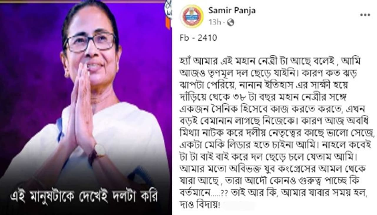প্রকাশ্য ফেসবুক পোস্টে বিধায়ক সমীর কুমার পাঁজা লিখেছেন, ‘হ্যাঁ আমার এই মহান নেত্রীটা আছে বলেই , আমি আজও তৃণমূল দল ছেড়ে যাইনি। কারণ কত ঝড় ঝাপটা পেরিয়ে, নানান ইতিহাস এর সাক্ষী হয়ে দাঁড়িয়ে থেকে ৩৮ টা বছর মহান নেত্রীর সঙ্গে একজন সৈনিক হিসেবে কাজ করতে করতে, এখন বড়ই বেমানান লাগছে নিজেকে। কারণ আজ অবধি মিথ্যা নাটক করে দলীয় নেতৃত্বের কাছে ভালো সেজে, একটা মেকি লিডার হতে চাইনা আমি। নাহলে কবেই টা টা বাই বাই করে দল ছেড়ে চলে যেতাম আমি। আমার মতো অবিভক্ত যুব কংগ্রেসের আমল থেকে যারা আছে , তারা আদৌ কোনও গুরুত্ব পাচ্ছে কি বর্তমানে.....?? তাই আর কি, আমার যাবার সময় হল, দাও বিদায়!’ এই লেখার সাথে নিচে যোগ করা রয়েছে মমতা বন্দ্যোপাধ্যায়ের হাত জোড় করা ছবি, যার নিচের ক্যাপশন ‘এই মানুষটাকে দেখেই দলটা করি’।