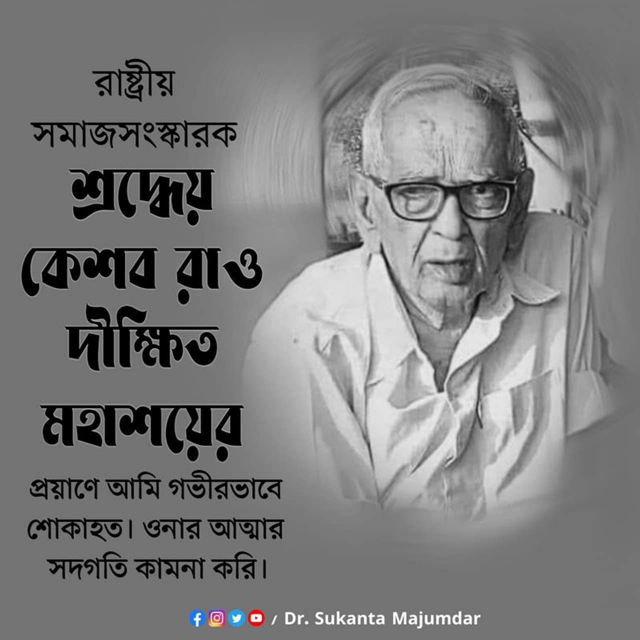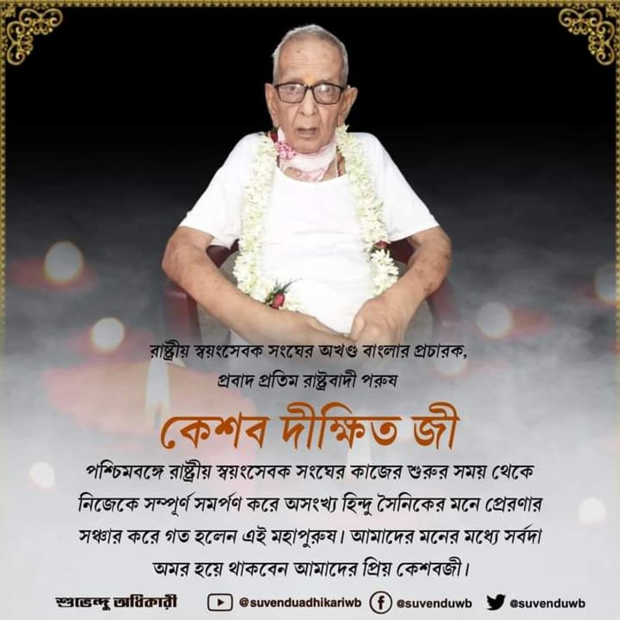 শোকবার্তা জানিয়েছেন বিরোধী দলনেতা শুভেন্দু অধিকারীও। সোশ্যাল মিডিয়ায় শুভেন্দু লিখেছেন,"রাষ্ট্রীয় স্বয়ংসেবক সংঘের বর্ষীয়ান রাষ্ট্রবাদী প্রচারক মাননীয় শ্রী কেশব রাও দীক্ষিত জী সংঘের কাজের শুরুর সময় থেকে নিজেকে সম্পূর্ণ সমর্পণ করে অসংখ্য দেশবাসীর হৃদয়ে অনুপ্রেরণার সঞ্চার করেছেন। পশ্চিমবঙ্গকে আপন করে সংঘের প্রচারে অগ্রদূত হয়ে কাজ করেছেন প্রবাদ প্রতিম রাষ্ট্রবাদী এই মহাপুরুষ। আমাদের হৃদয়ে সর্বদা অমর হয়ে থাকবেন আমাদের প্রিয় কেশব জী। আমি ওনার বিদেহী আত্মার প্রতি আমার সশ্রদ্ধ প্রণাম নিবেদন করি। ওম শান্তি।"