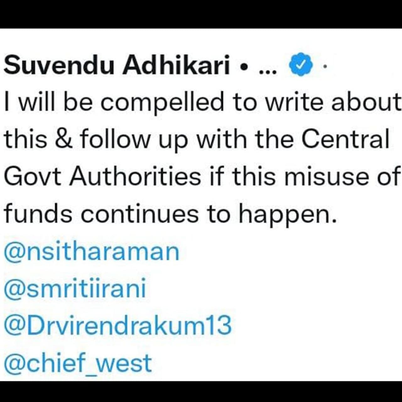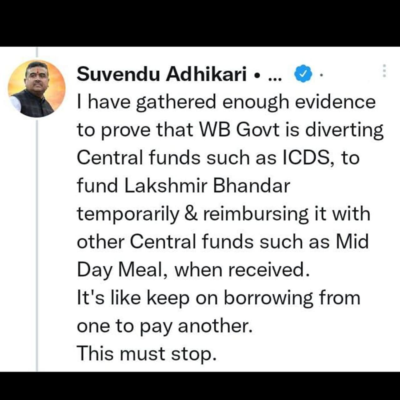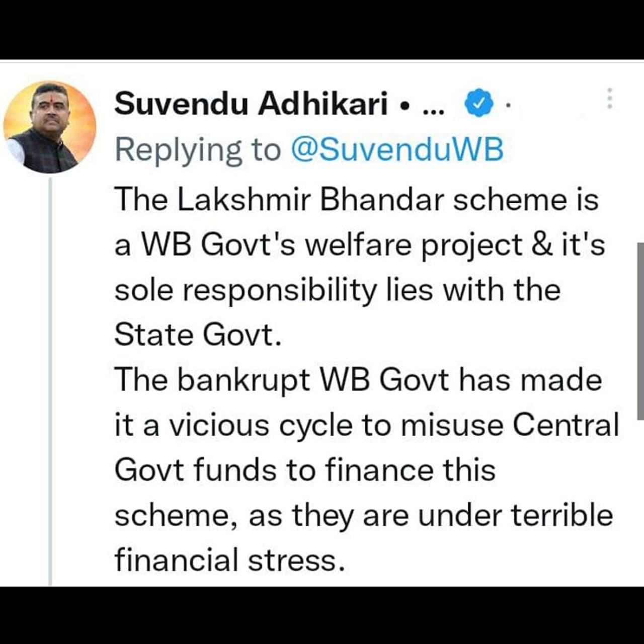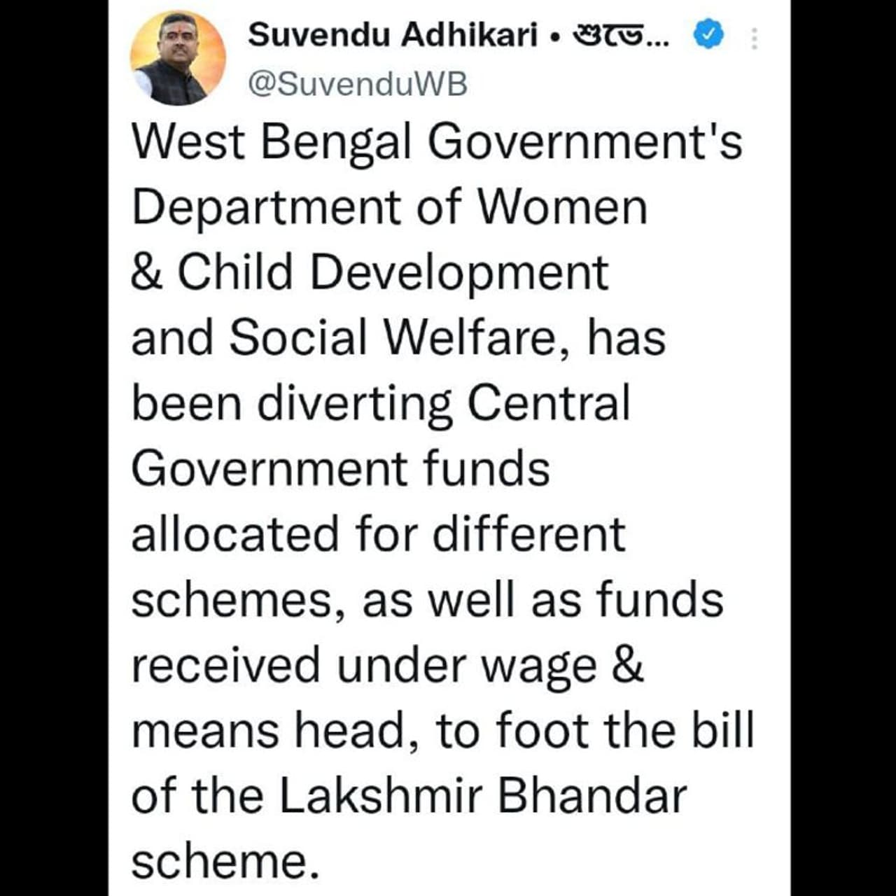 শুভেন্দু অধিকারী বলেন, পশ্চিমবঙ্গ সরকারের মহিলা ও শিশু উন্নয়ন ও সমাজকল্যাণ বিভাগ বিভিন্ন প্রকল্পের জন্য বরাদ্দ করা কেন্দ্রীয় সরকারের তহবিল সেইসঙ্গে মজুরি ও অর্থের অধীনে প্রাপ্ত তহবিল লক্ষ্মীর ভাণ্ডার প্রকল্পের জন্য বরাদ্দ করছে। তিনি আরও বলেছেন লক্ষ্মীর ভাণ্ডার হল পশ্চিমবঙ্গ সরকারের একটি কল্যাণমূলক প্রকল্প। এটির একমাত্র দায়িত্ব রাজ্য সরকারের। শুভেন্দুর কথায় দেউলিয়া হয়ে গেছে রাজ্য সরকার। এই প্রকল্প অর্থাৎ লক্ষ্মীর ভাণ্ডারের টাকার জন্য কেন্দ্রীয় সরকারের তহবিলের অপব্যবহার করছে। একটি দুষ্টচক্রও তৈরি করেছে, কারণ রাজ্য সরকার ভয়ানক আর্থিক চাপের মধ্যে রয়েছে।