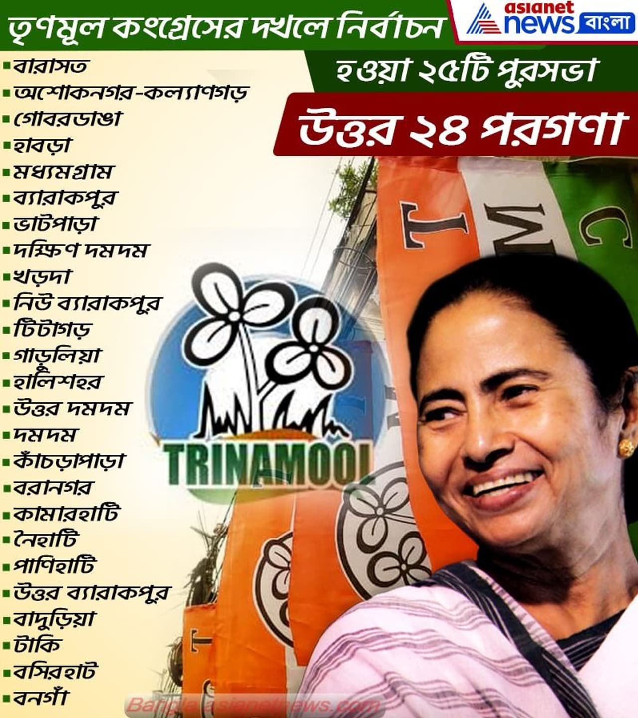 Breaking News- উত্তর ২৪ পরগণার নির্বাচন হওয়া ২৫টি পুরসভাতেই ঘাসফুলের দাপ। তৃণমূলের দখলে বারাসত পুরসভা, অশোকনগর-কল্যাণগড় পুরসভা, গোবরডাঙা পুরসভা, হাবড়া পুরসভা, মধ্যমগ্রাম পুরসভা, ব্যারাকপুর পুরসভা, ভাটপাড়া পুরসভা, দক্ষিণ দমদম পুরসভা, খড়দা পুরসভা, নিউ ব্যারাকপুর পুরসভা, টিটাগড় পুরসভা, গাড়ুলিয়া পুরসভা, হালিশহর পুরসভা, উত্তর দমদম পুরসভা, দমদম পুরসভা, কাঁচড়াপাড়া পুরসভা, বরানগর পুরসভা, কামারহাটি পুরসভা, নৈহাটি পুরসভা, পাণিহাটি পুরসভা, উত্তর ব্যারাকপুর পুরসভা, বাদুড়িয়া পুরসভা, টাকি পুরসভা, বসিরহাট পুরসভা, বনগাঁ পুরসভা।
