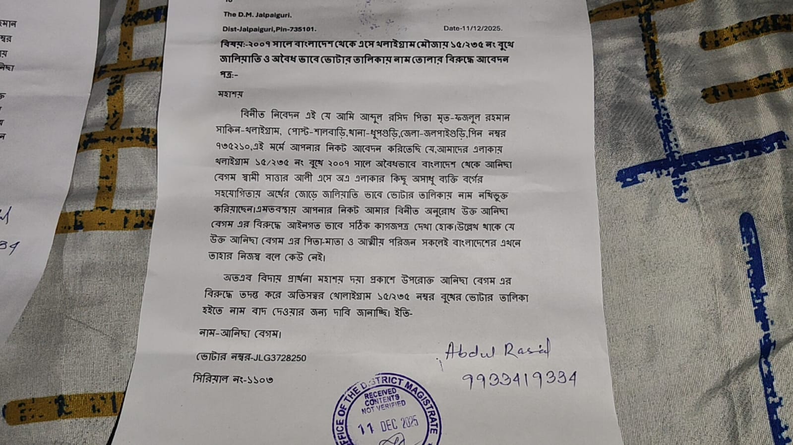 রশিদের দাবি, আনিছা বেগম অবৈধ পথে বাংলাদেশ থেকে এদেশে প্রবেশ করে প্রায় ২০০৭ সাল নাগাদ ভোটার তালিকায় নাম তোলেন এবং ধীরে ধীরে শাসকদলের ঘনিষ্ঠ হয়ে ওঠেন। অভিযোগ, রাজ্যে পালাবদলের পর শাসকদলের প্রভাব কাজে লাগিয়ে প্রথমে স্বনির্ভর গোষ্ঠীর বিভিন্ন দায়িত্ব পান আনিছা বেগম। পরে মহাসংঘের কর্মকর্তা নির্বাচিত হন এবং শেষ পর্যন্ত ২০২৩ সালে তৃণমূলের টিকিটে জয়ী হয়ে ধূপগুড়ি পঞ্চায়েত সমিতির সদস্যা হন। অভিযোগকারীর আরও দাবি, তাঁর স্বামী সাত্তার আলি সহ বাবা-মা এখনও বাংলাদেশের নাগরিক এবং সেখানেই বসবাস করেন।