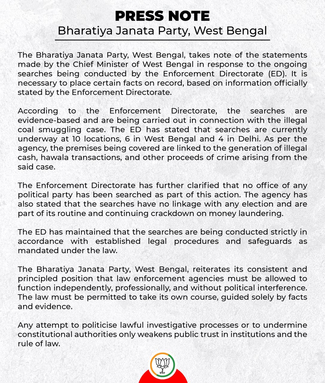 পাল্টা রাজ্য বিজেপির (West Bengal BJP) তরফে বিবৃতি দিয়ে মুখ্যমন্ত্রীর বক্তব্যে জবাব দেওয়া হয়েছে। সেখানে বলা হয়েছে, 'এনফোর্সমেন্ট ডিরেক্টরেটের মতে, এই তল্লাশি অভিযানগুলো প্রমাণ-ভিত্তিক এবং অবৈধ কয়লা পাচার মামলার সঙ্গে সম্পর্কিত। ইডি জানিয়েছে যে বর্তমানে ১০টি স্থানে তল্লাশি চলছে, যার মধ্যে ৬টি পশ্চিমবঙ্গে এবং ৪টি দিল্লিতে। সংস্থাটির মতে, যে স্থানগুলোতে তল্লাশি চালানো হচ্ছে, সেগুলো উক্ত মামলা থেকে উদ্ভূত অবৈধ নগদ অর্থ, হাওয়ালা লেনদেন এবং অন্যান্য অপরাধমূলক আয়ের সঙ্গে যুক্ত। এনফোর্সমেন্ট ডিরেক্টরেট আরও স্পষ্ট করেছে যে এই অভিযানের অংশ হিসেবে কোনও রাজনৈতিক দলের কার্যালয়ে তল্লাশি চালানো হয়নি। সংস্থাটি আরও জানিয়েছে যে এই তল্লাশিগুলোর সঙ্গে কোনও নির্বাচনের কোনও সম্পর্ক নেই এবং এটি অর্থ পাচারের বিরুদ্ধে তাদের নিয়মিত ও চলমান অভিযানেরই একটি অংশ। ইডি স্পষ্ট করেছে যে এই তল্লাশিগুলো আইন অনুযায়ী নির্ধারিত প্রতিষ্ঠিত আইনি পদ্ধতি এবং সুরক্ষাব্যবস্থা কঠোরভাবে অনুসরণ করে পরিচালিত হচ্ছে।'