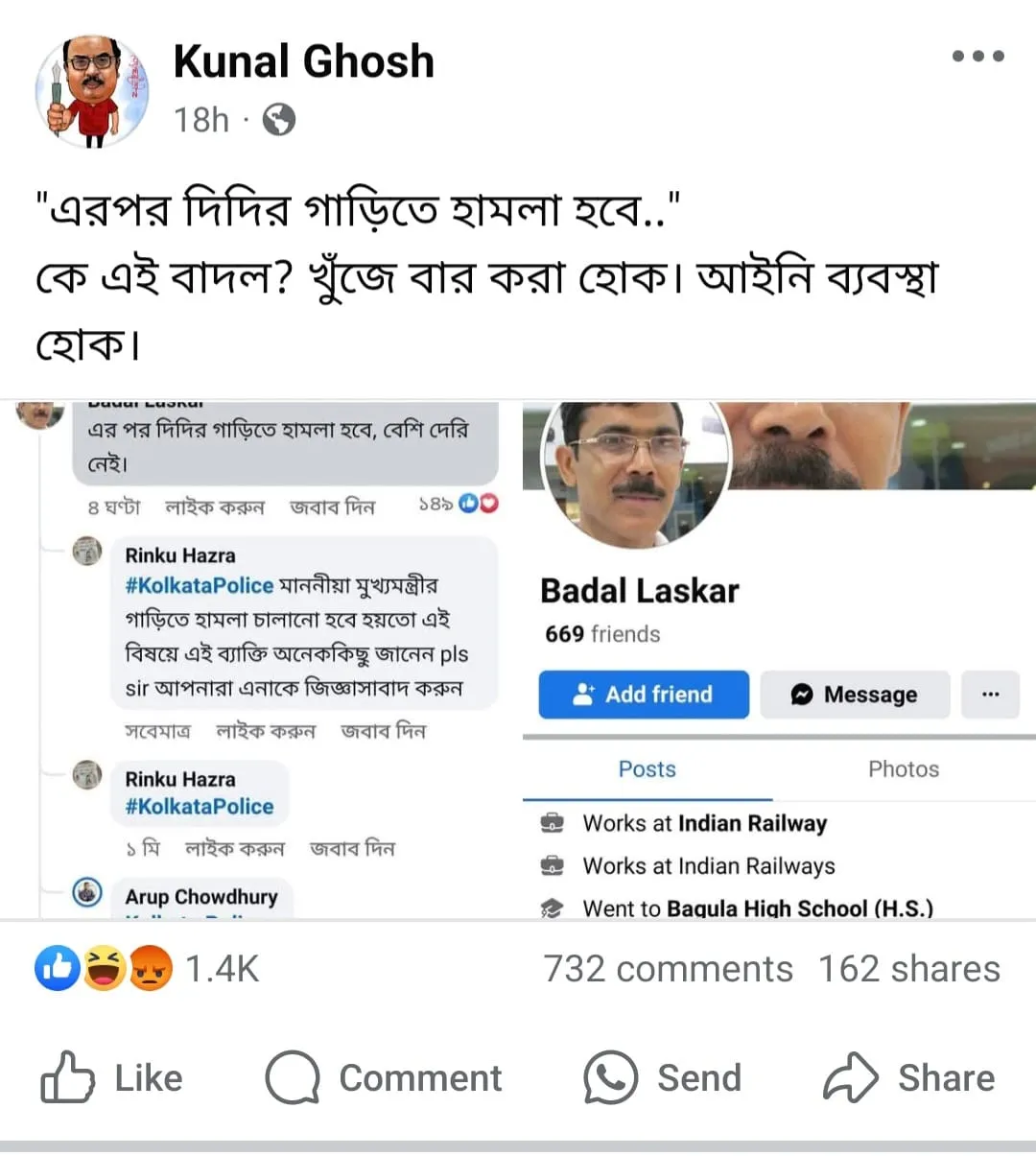 একটি পোস্ট সম্প্রতি সোশ্যাল মিডিয়ায় ভাইরাল হয়েছে। মুখ্যমন্ত্রীর গাড়িতে হামলা হতে পারে, বেশি দেরি নেই, এই বক্তব্য দিয়ে সোশ্যাল মিডিয়ায় বিতর্কিত পোষ্ট করেছেন দুর্গাপুরের অবসরপ্রাপ্ত রেল কর্মী বাদল লস্কর।