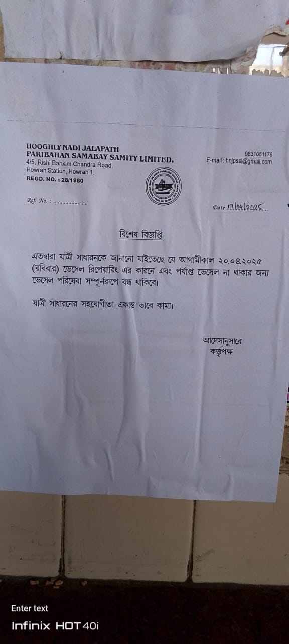 কী কারণে ফেরি সার্ভিস বন্ধ রয়েছে তা নিয়ে কর্তৃপক্ষ মুখে কুলুপ এঁটেছে। যদিও হুগলি নদী জলপথ পরিভ্রমণ সমবায় সমিতি -র তরফ থেকে একটি নোটিশ গেটে সাঁটা হয়েছে। সেখানে বলাহয়েছে আজ অর্থাৎ ২০ এপ্রিলভেসেল রিপেয়ারিং -এর কারণে আর পর্যাপ্ত ভেসেল না থাকার কারণে ভেসেল পরিষেবা সম্পূর্ণ বন্ধ থাকবে। পাশাপাশি যাত্রীদের পক্ষ থেকে সহযোগিতা চেয়েছে কর্তৃপক্ষ।