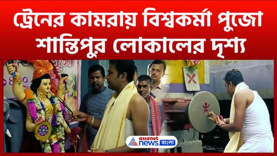 লোকাল ট্রেনের কামরায় বিশ্বকর্মার আরাধনা। ফুল ও রংবেরঙের বেলুন দিয়ে সাজানো ট্রেনের কামরা। চলন্ত ট্রেনেই মন্ত্র পাঠ, পুজো ও প্রসাদ বিতরণ। ১৬ বছর ধরে এভাবেই পালন হচ্ছে বিশ্বকর্মা পুজো। শান্তিপুর লোকালে এভাবেই বছরের পর বছর হয়ে আসছে বিশ্বকর্মার আরাধনা।