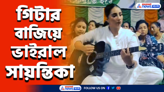 প্রতিবাদ মঞ্চে গিটার বাজিয়ে ভাইরাল সায়ন্তিকা বন্দ্যোপাধ্যায়। বরানগরের তৃণমূল বিধায়ক সায়ন্তিকা বন্দ্যোপাধ্যায়। সকলে গাইছিলেন 'আগুনের পরশমণি ছোঁয়াও প্রাণে'।