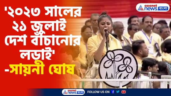 শহিদ দিবসের মঞ্চ থেকে সায়নী ঘোষ বলেন, '১৯৯৩ সালের লড়াই ছিল রাজ্য বাঁচানোর লড়াই, আর ২০২৩ সালের ২১ জুলাই দেশ বাঁচানোর লড়াই।'
